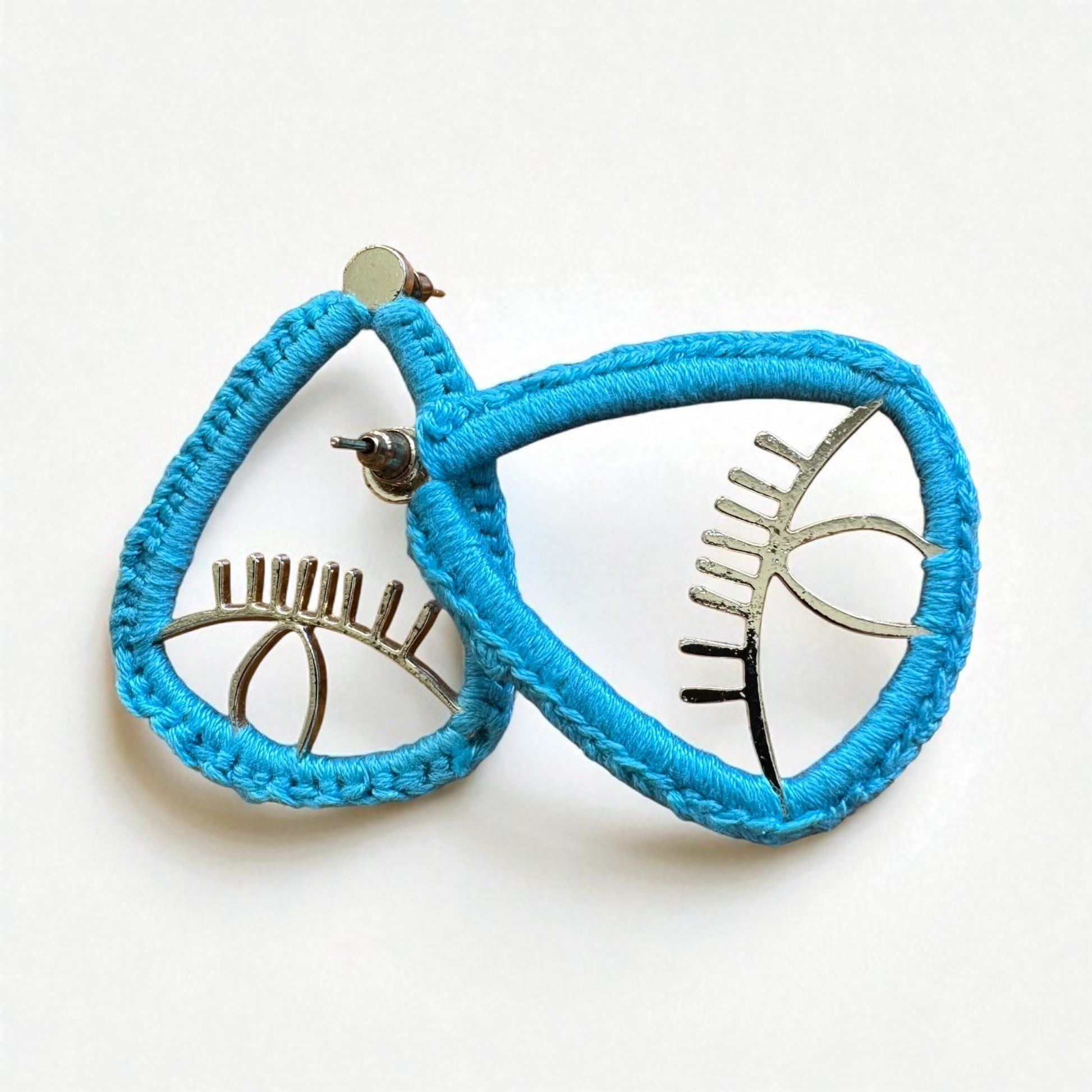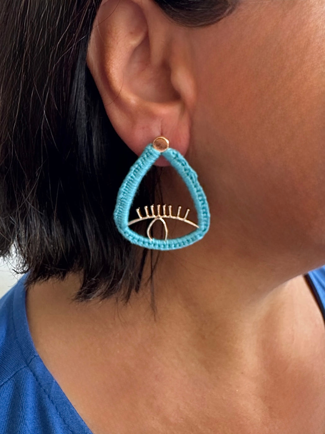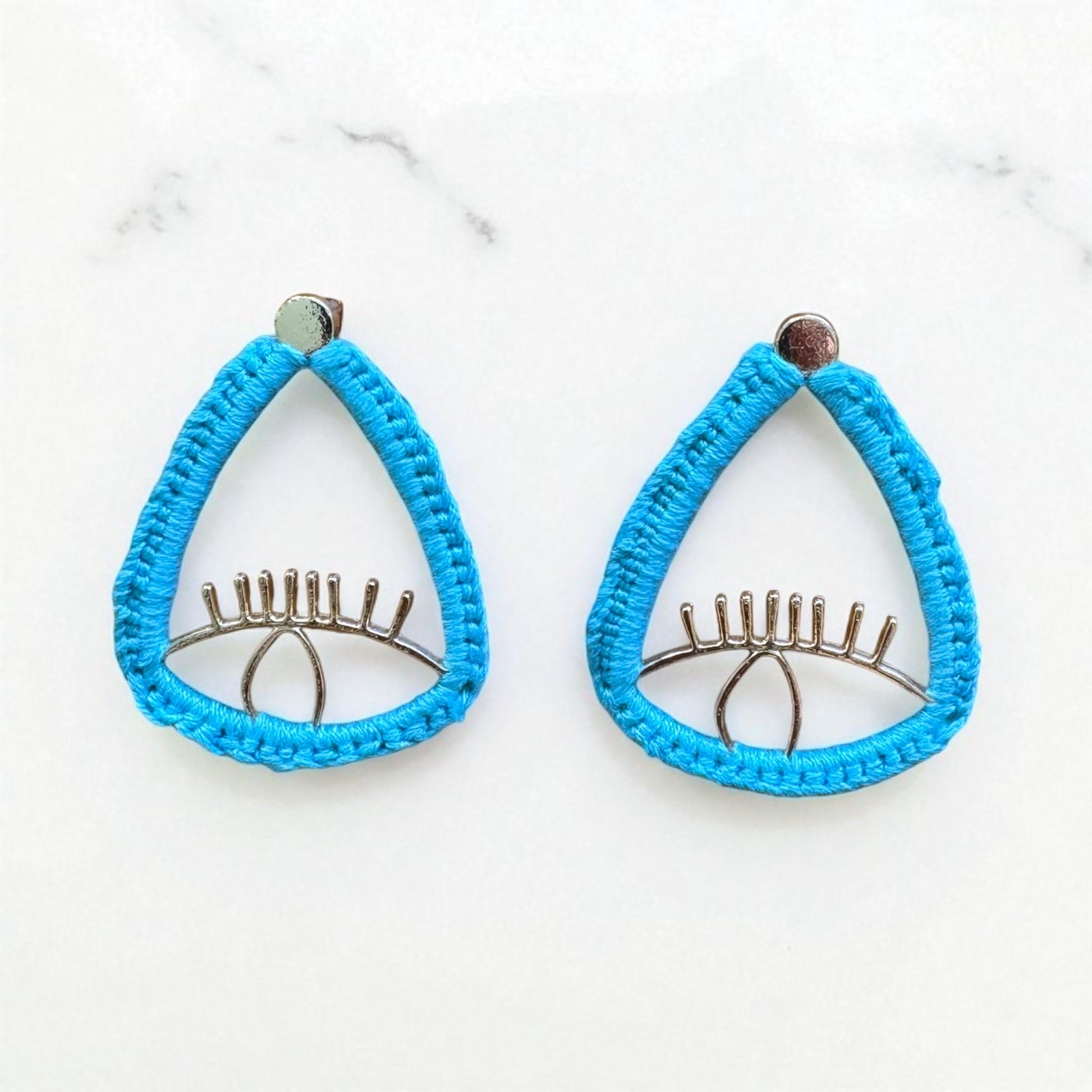 Beschreibung: Handgefertigte Statement-Ohrringe in Tropfenform mit modernem Eye-Design. Der Rahmen ist mit türkisfarbenem Garn umwickelt und sorgt für einen frischen, sommerlichen Look. Leicht und auffällig – perfekt für alle, die einzigartige Accessoires lieben.