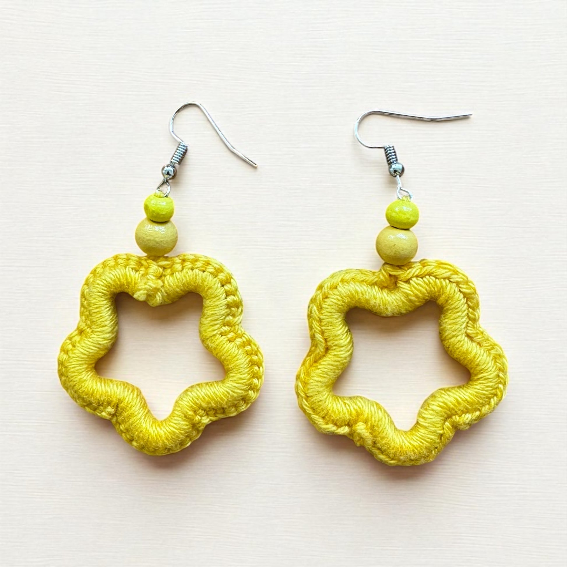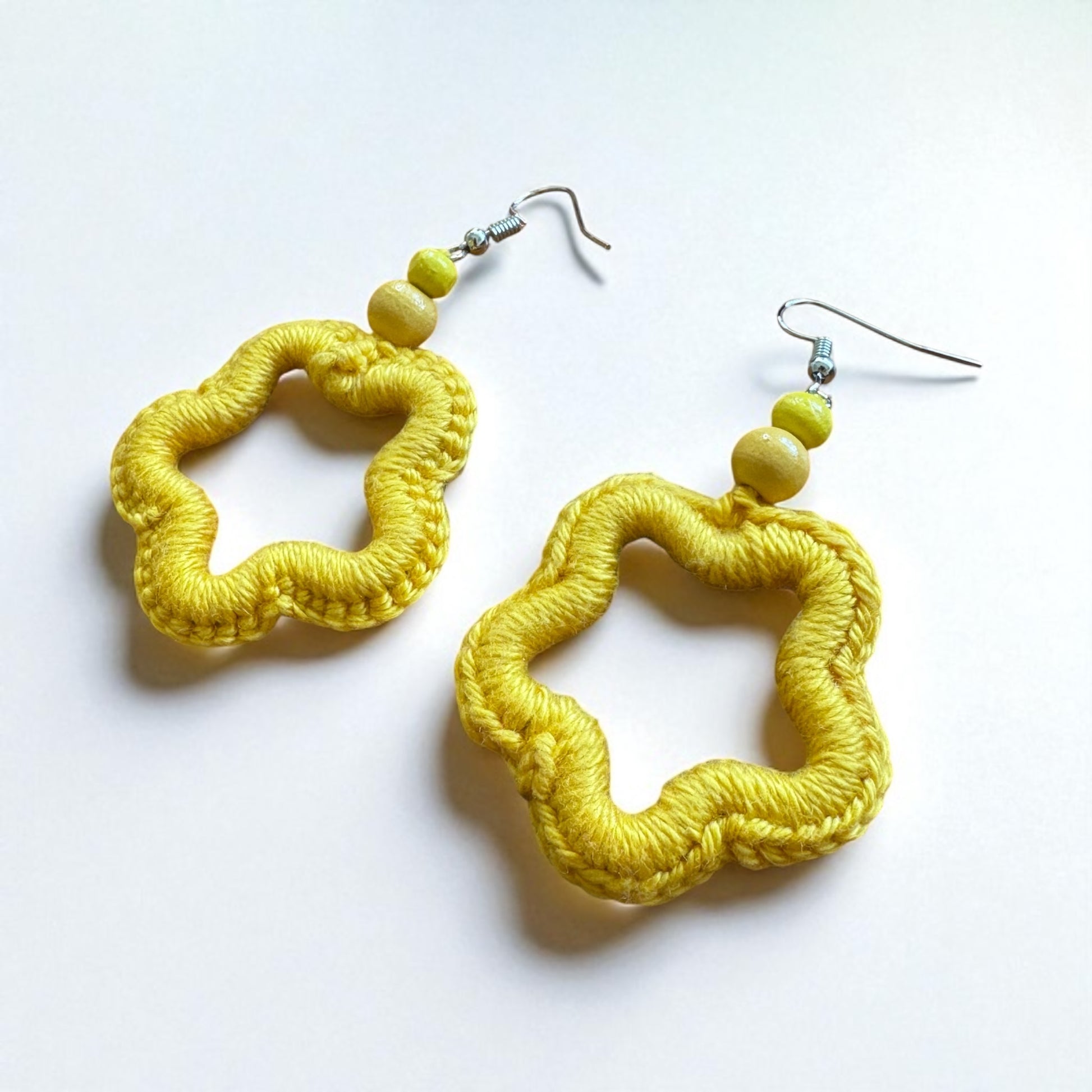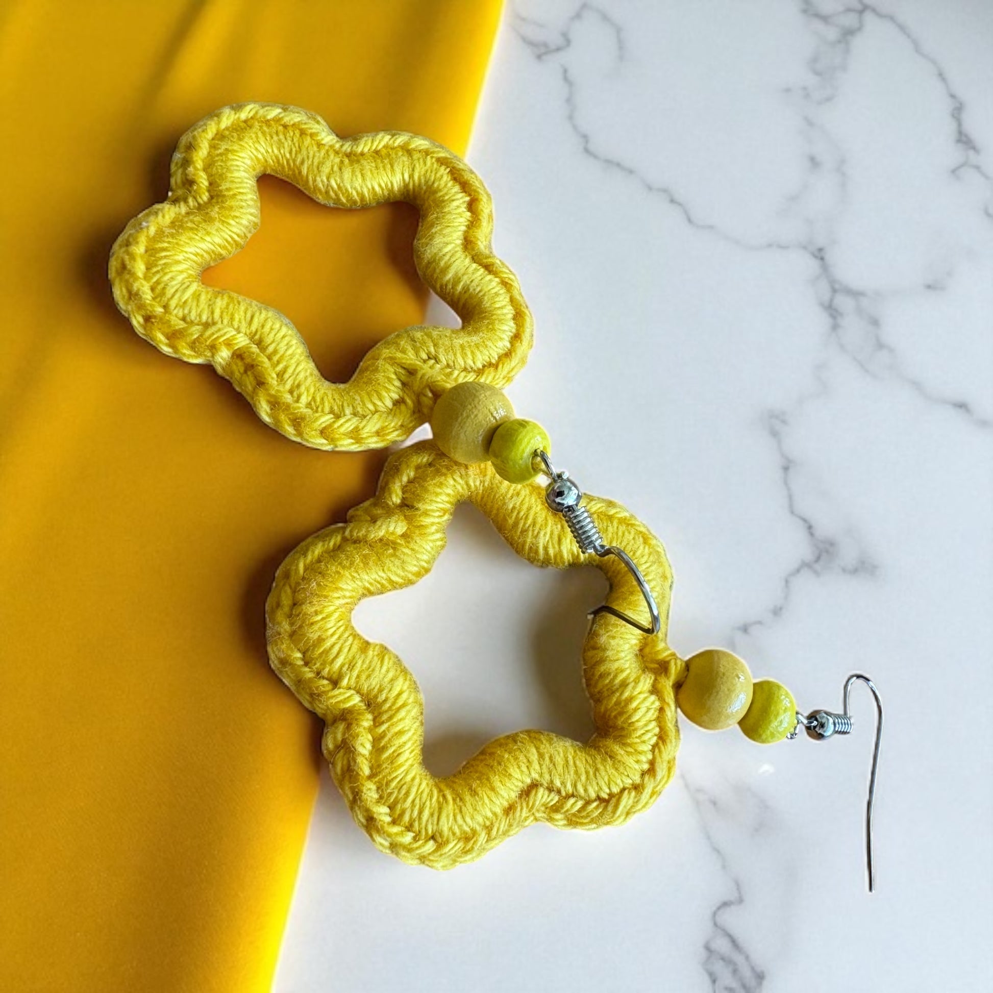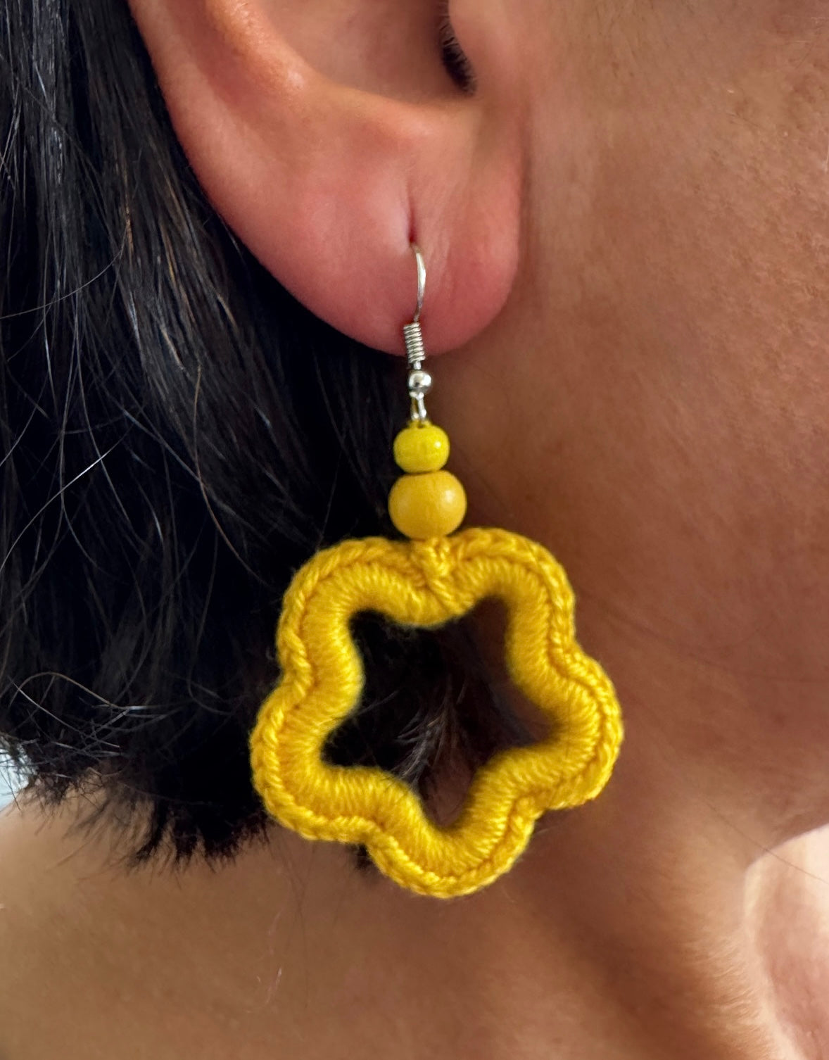 Beschreibung: Handgemachte Statement-Ohrringe in strahlendem Gelb. Die verspielte Blütenform, kombiniert mit leichten Holzperlen, bringt Sommer-Feeling in jedes Outfit. Leicht, farbenfroh und ein echter Hingucker.