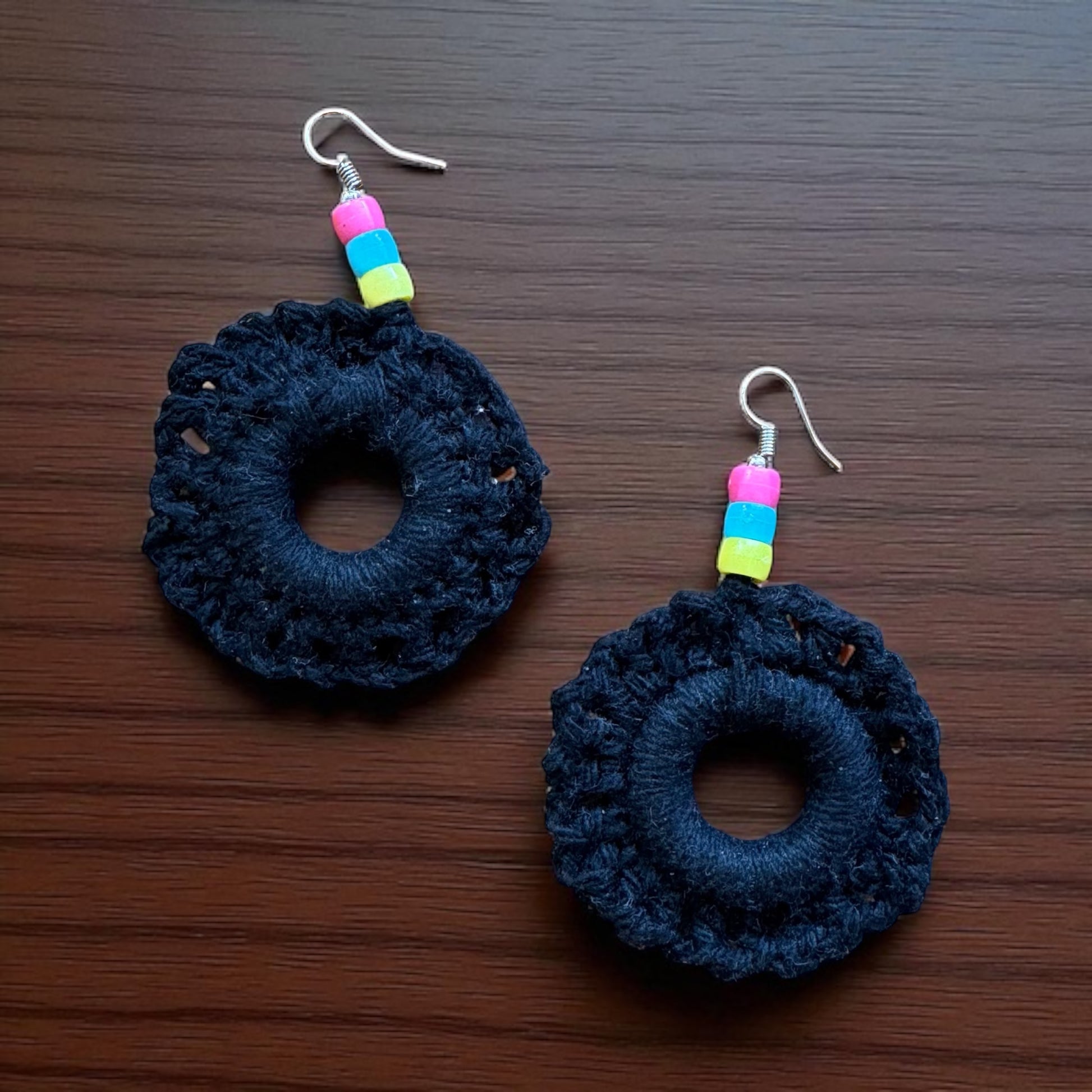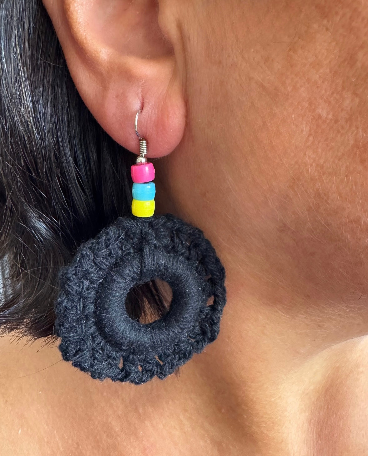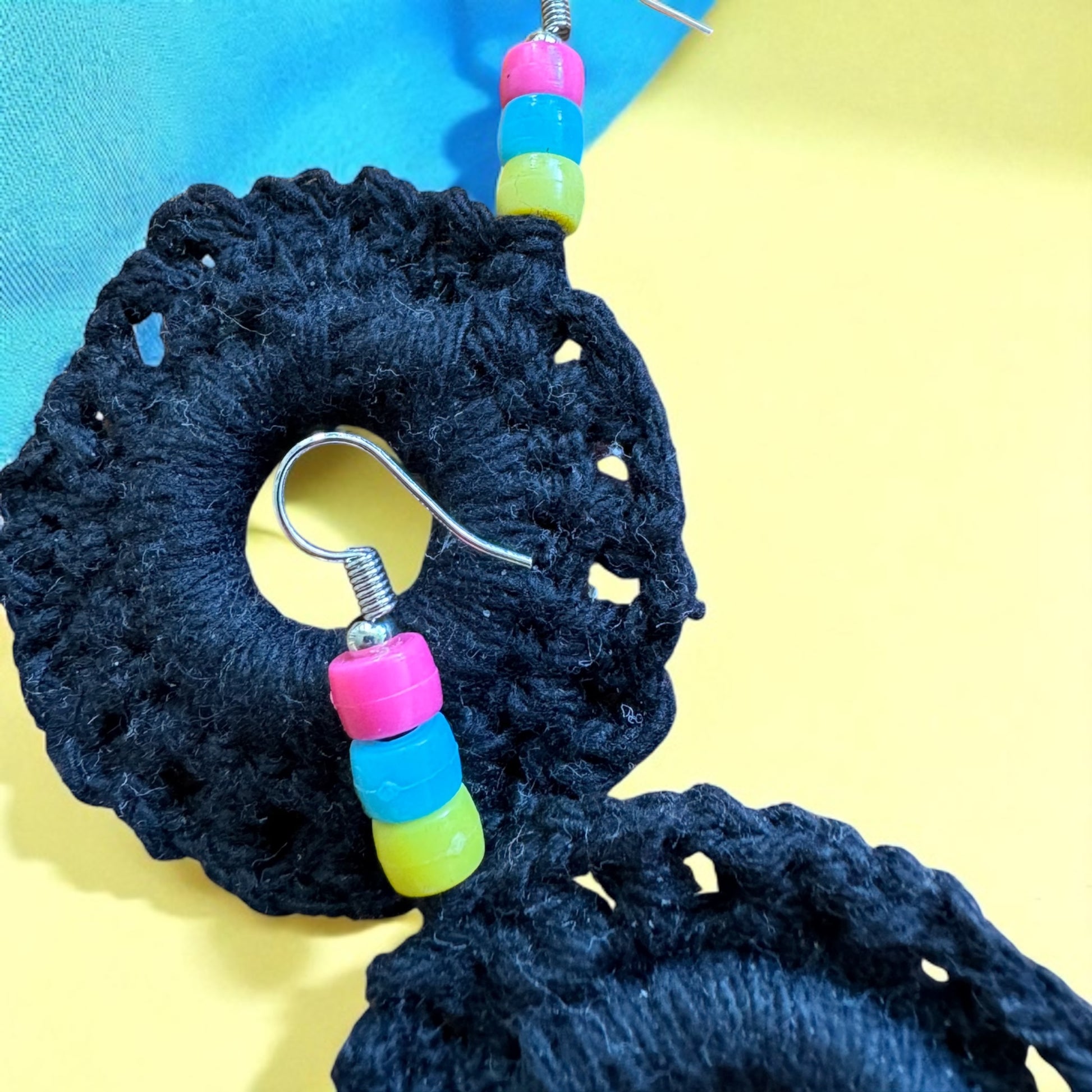 Beschreibung: Stylische, handgehäkelte Ohrringe in klassischem Schwarz mit bunten Perlen als verspieltem Farbakzent. Das runde, durchbrochene Design macht sie zu einem modernen Statement-Piece, das sowohl zu schlichten als auch zu auffälligen Outfits passt.