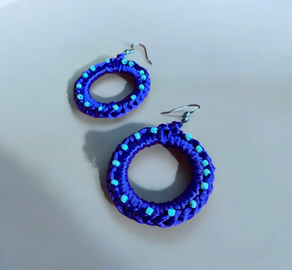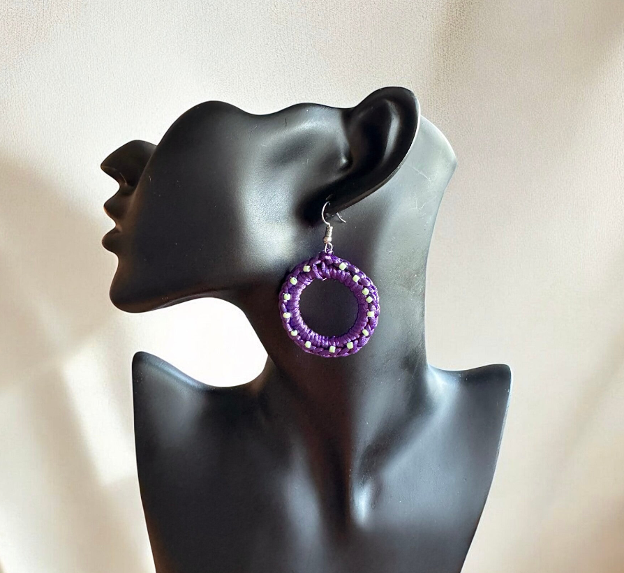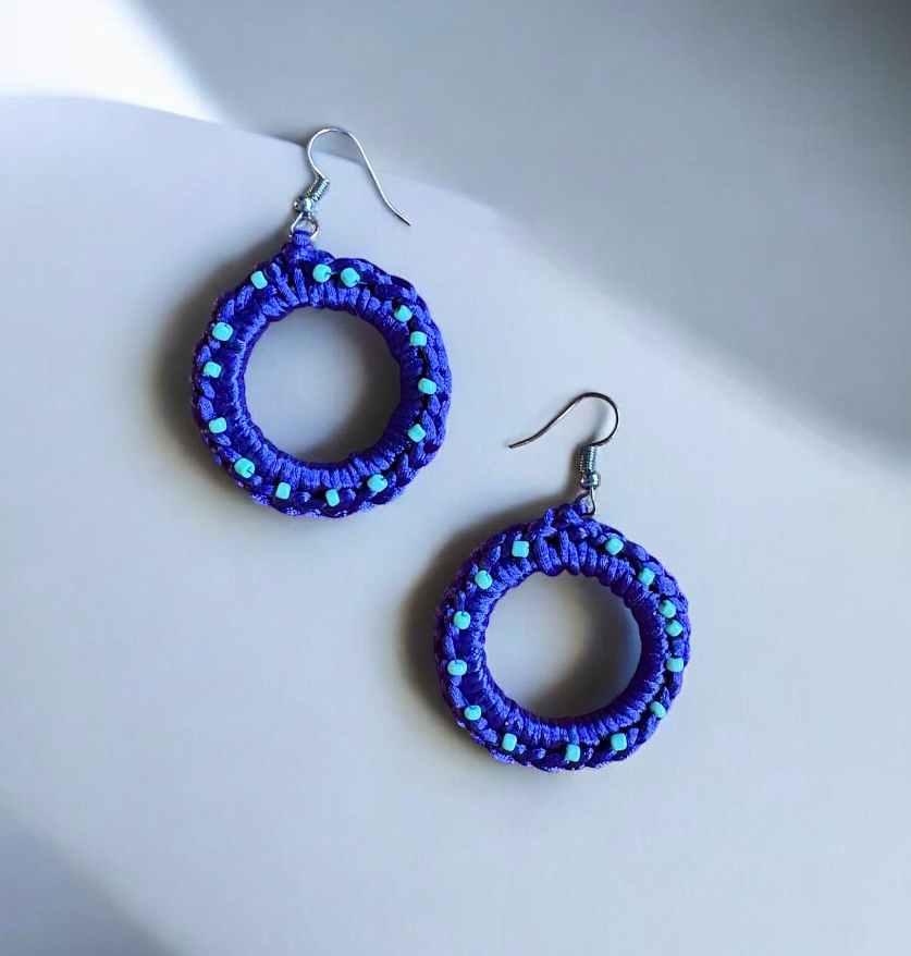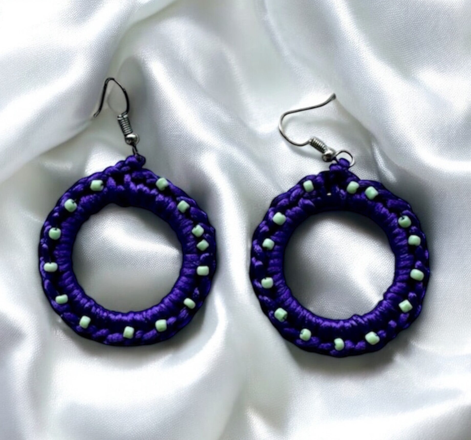 Beschreibung: Runde, handgehäkelte Ohrringe in kräftigem Lila mit feinen, aufgestickten Perlen. Leicht, verspielt und ideal für den Boho- oder Festival-Style. Jedes Paar ist handgefertigt – einzigartig & liebevoll gemacht.