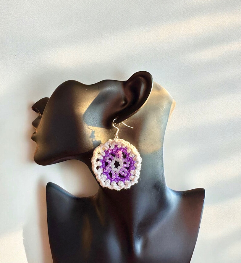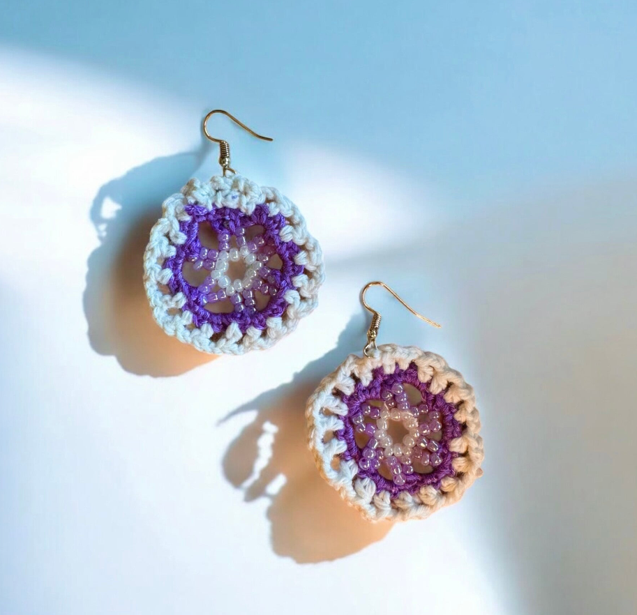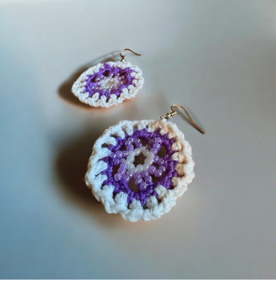 Beschreibung: Einzigartige Häkel-Ohrringe mit transparentem Glaskern, umrandet von handgehäkelter Spitze in Creme und Lila. Verziert mit feinen Perlen – ein zartes, verspieltes Accessoire für deinen Boho-Style.