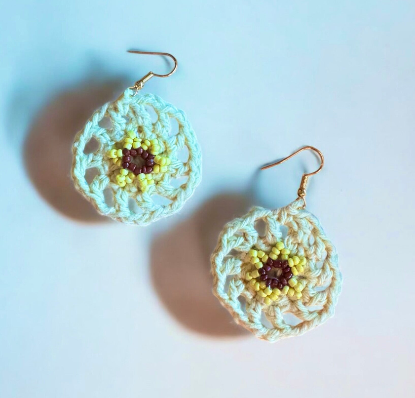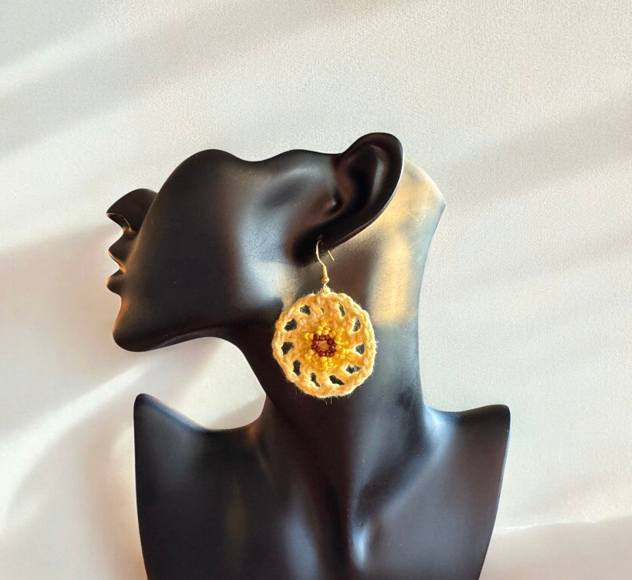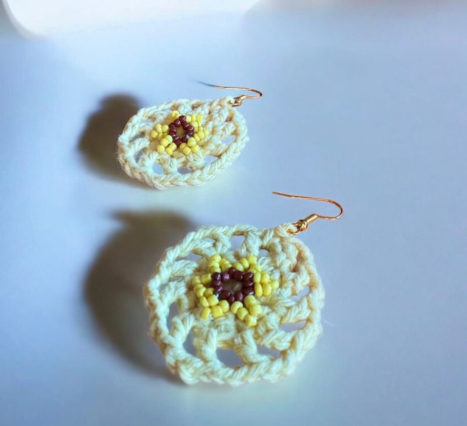 Beschreibung: Handgemachte Ohrringe mit gehäkelter Blume und Perlen in Gelb- und Brauntönen. Mit goldfarbenem Haken -leicht, sommerlich, einzigartig.