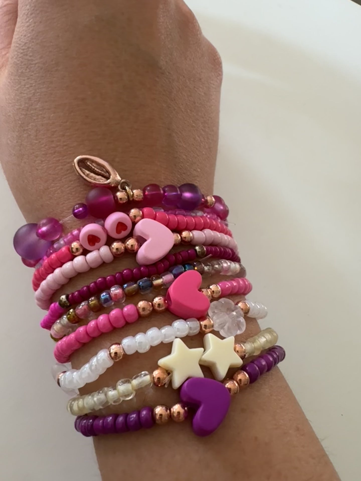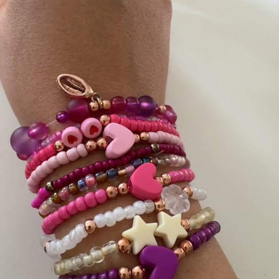 Beschreibung: Dieses Perlenarmband Set vereint zarte rosane Töne mit Herz- und Sternperlen sowie einem Anhänger aus Muschel, der feine rosenfarbene Akzente setzt. Ein stilvolles Accessoire, das eleganten Charme mit verspielter Individualität verbindet. Größe: Einheitsgröße, elastisch.