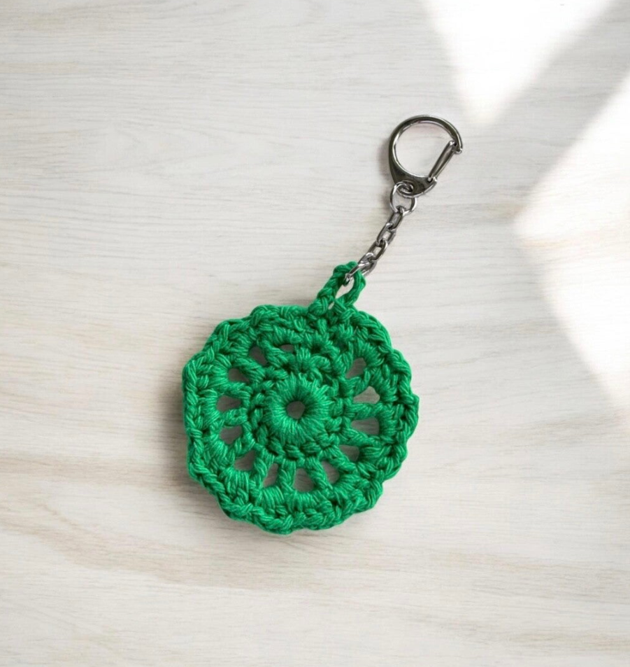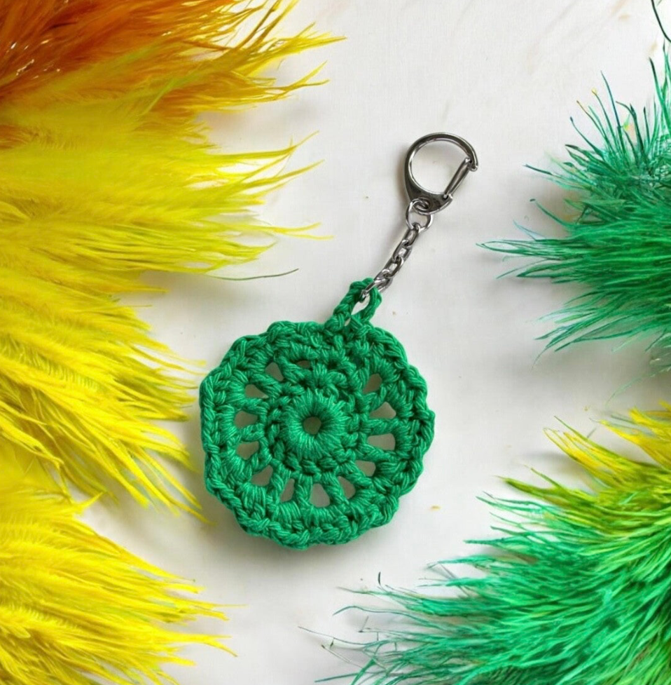 Beschreibung: Ein frischer Farbklecks für deinen Alltag: Der handgehäkelte Schlüsselanhänger in kräftigem Grün überzeugt mit einzigartigem Muster und hochwertiger Verarbeitung. Mit silbernem Karabiner – praktisch und dekorativ zugleich. Länge: 11cm.