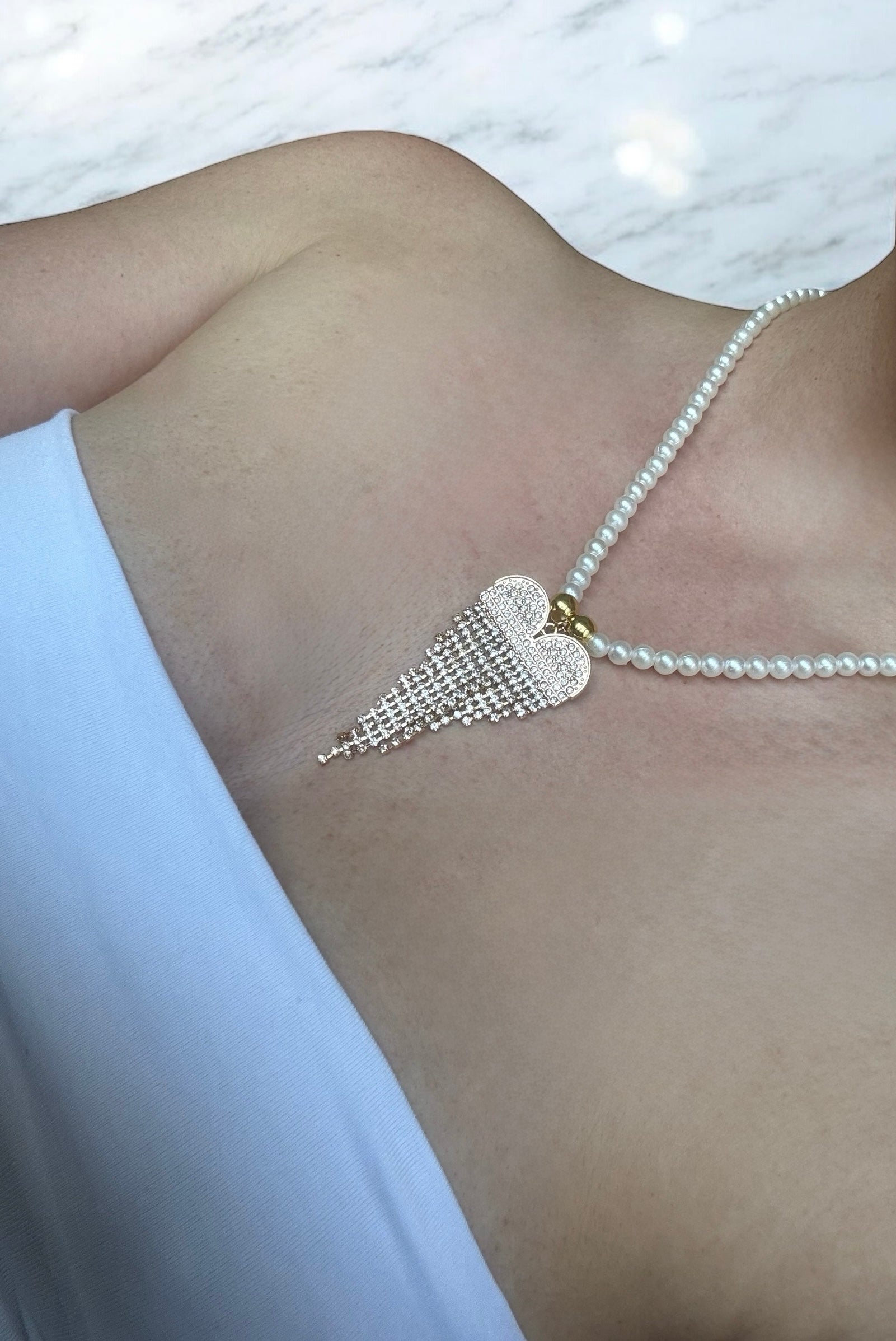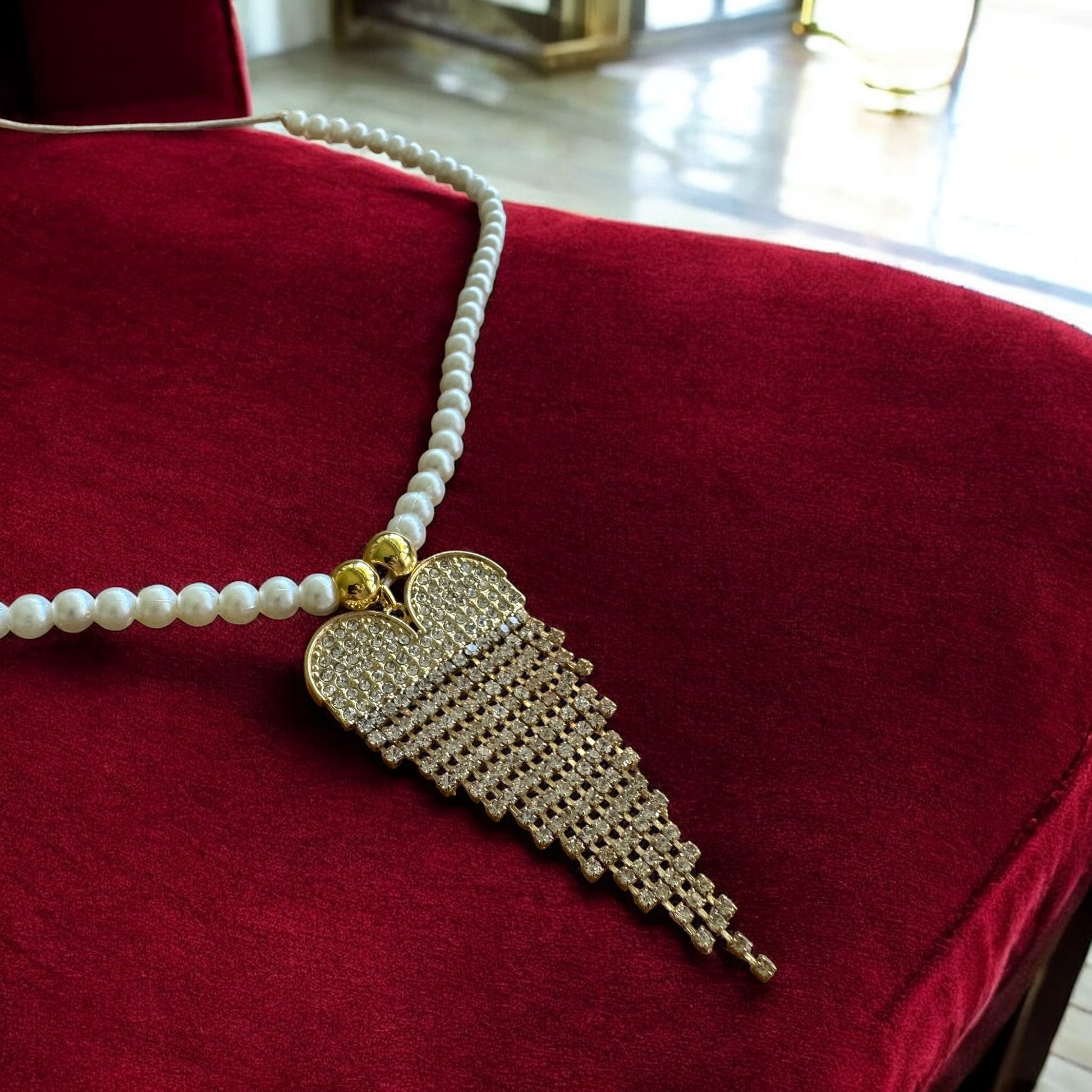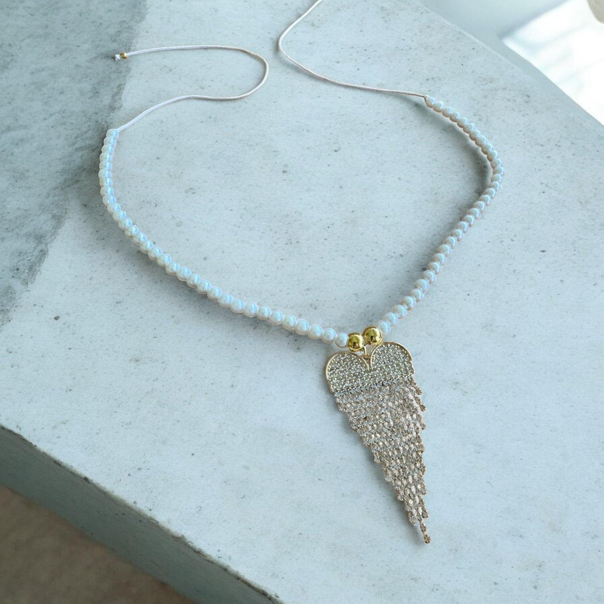 Beschreibung: Die Pearl Edition Halskette verbindet zarte Eleganz mit einem Hauch von Glamour. Feine, schimmernde Perlen umrahmen einen funkelnden Herzflügel-Anhänger, der mit goldenen Akzenten veredelt ist. Der filigrane Anhänger mit seinen herabfallenden Kettensträngen verleiht jedem Look himmlische Leichtigkeit und besondere Ausstrahlung