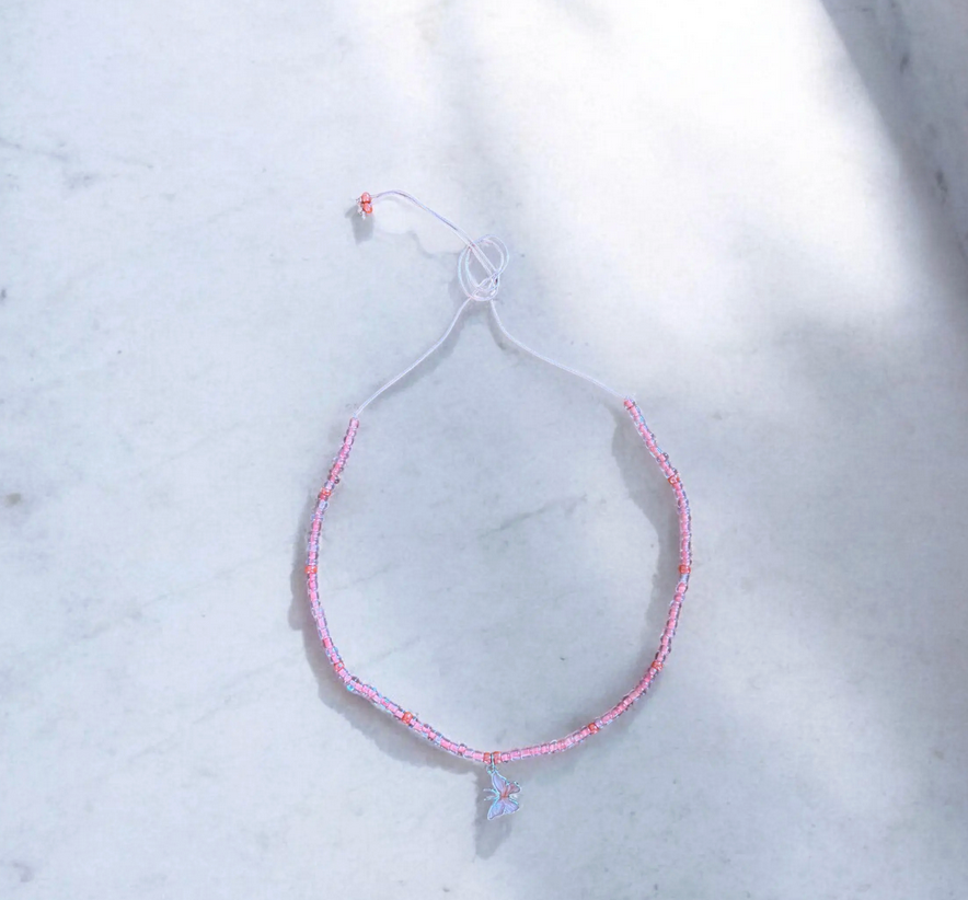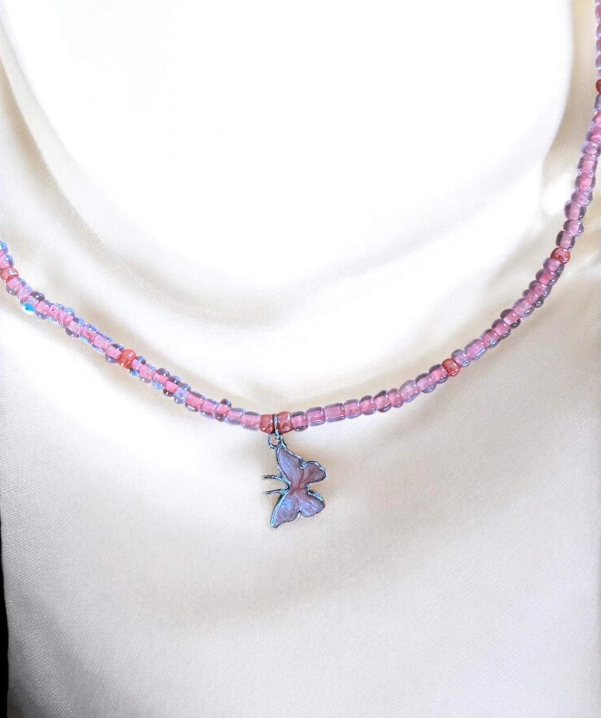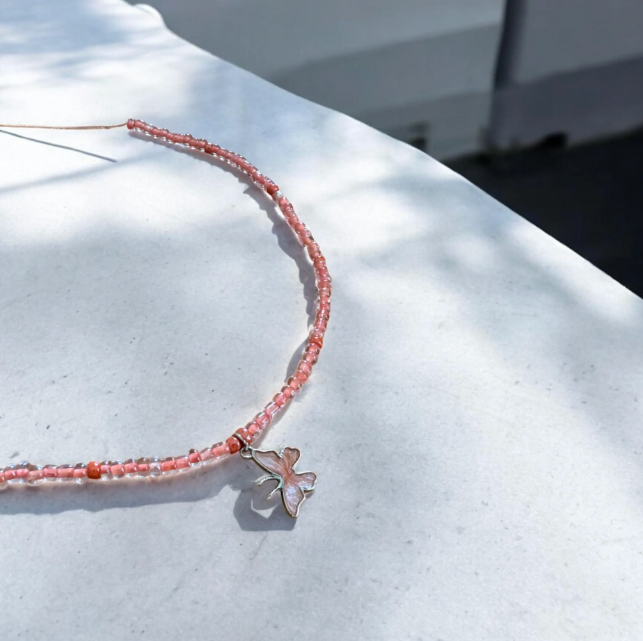 Beschreibung: Die BlushWings – Butterfly Charm Halskette ist ein zartes Statement voller Leichtigkeit. Handgereihte, rosé-transparente Perlen schmiegen sich sanft an dein Dekolleté, während ein eleganter Schmetterlingsanhänger in Perlmutt-Optik in der Sonne schimmert. Für romantische Seelen, Tagträumerinnen und alle, die den Sommer auf der Haut spüren wollen.