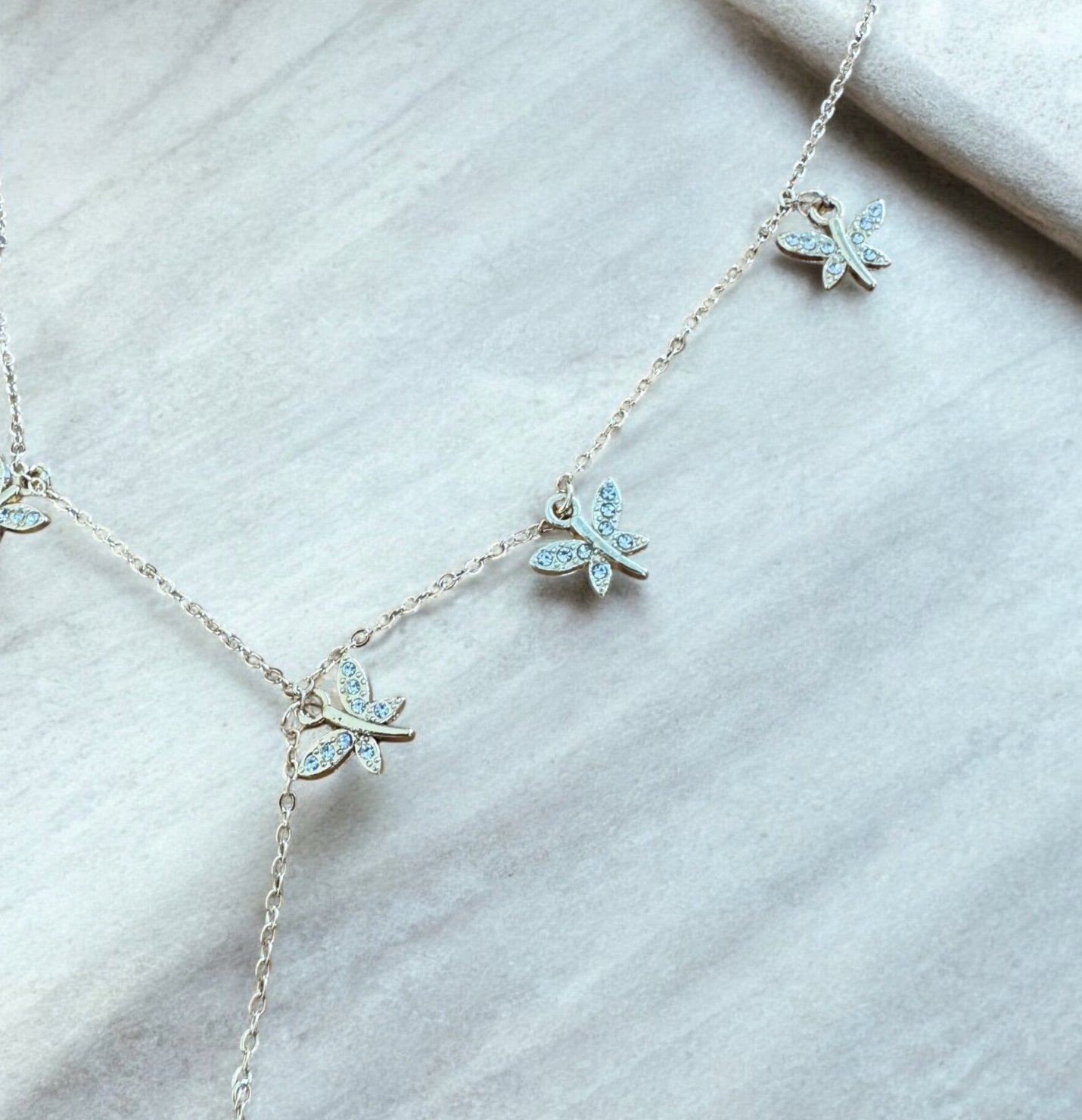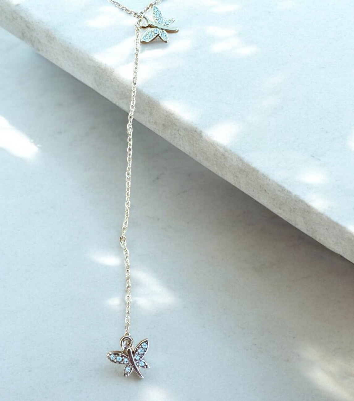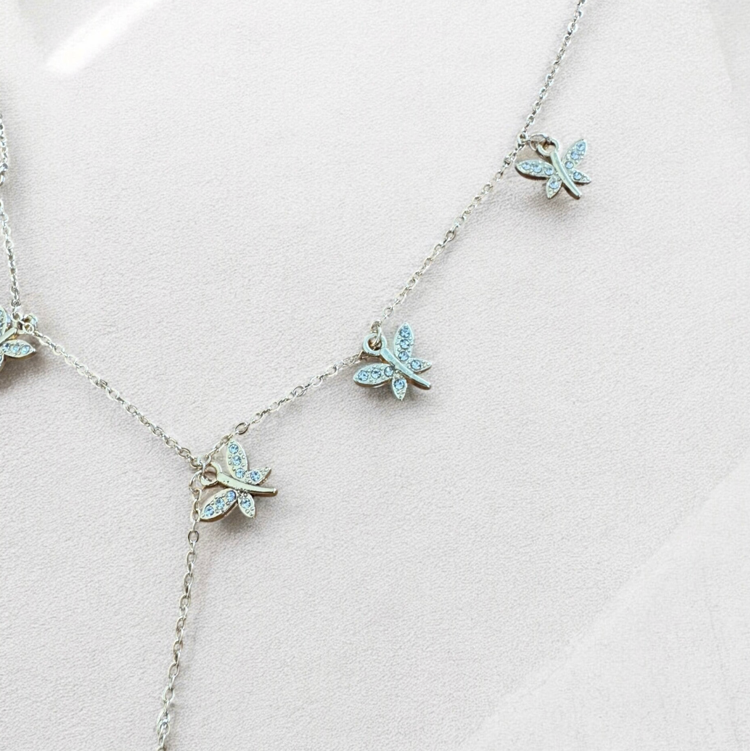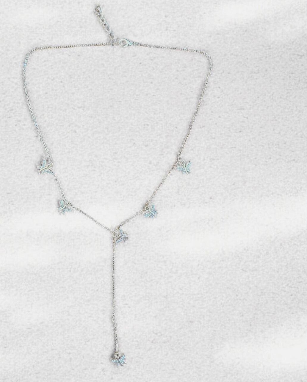 Beschreibung: Feine Y-Kette mit funkelnden blauen Schmetterlings- und Kristallanhängern. Perfekt für einen eleganten Look mit einem Hauch von Verspieltheit. Größe: 46cm, Anhänger: 10cm.