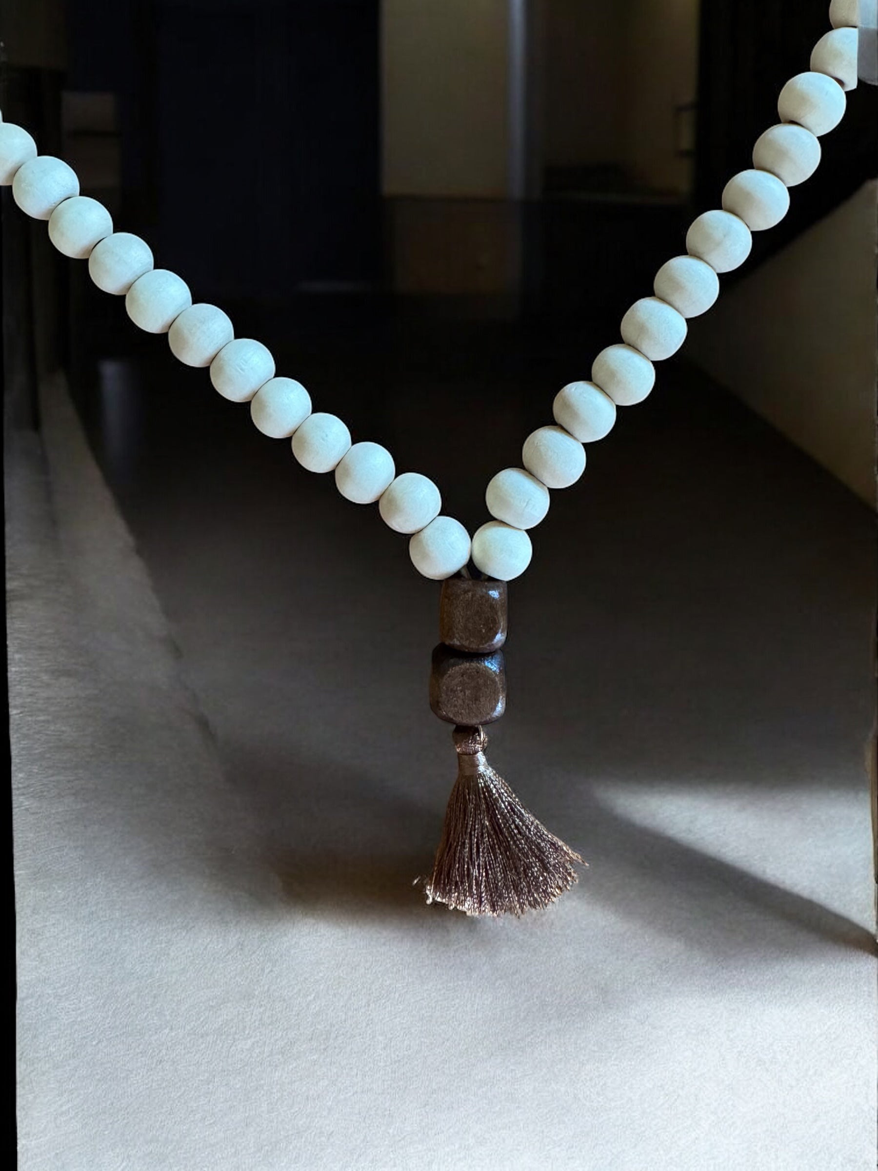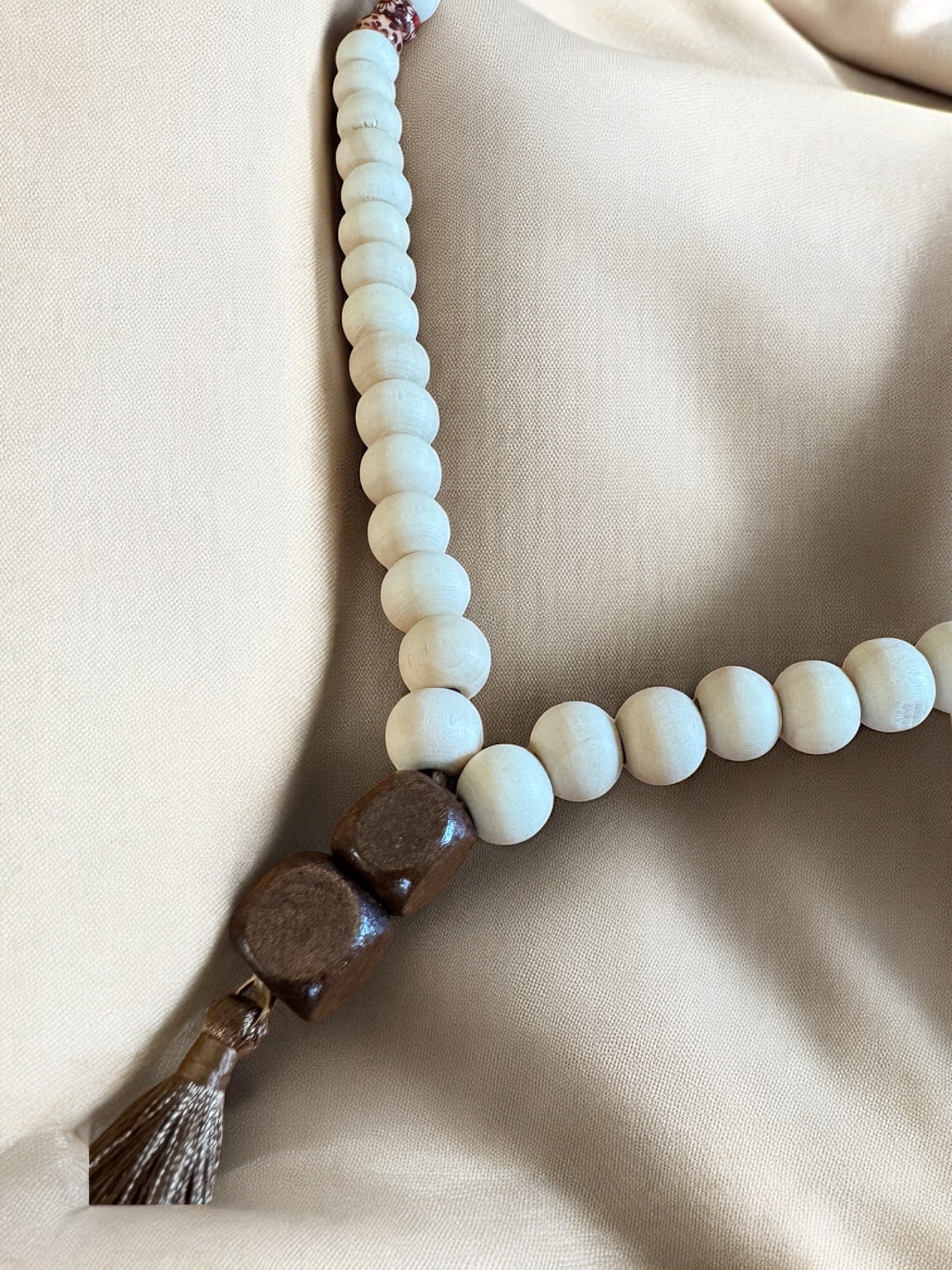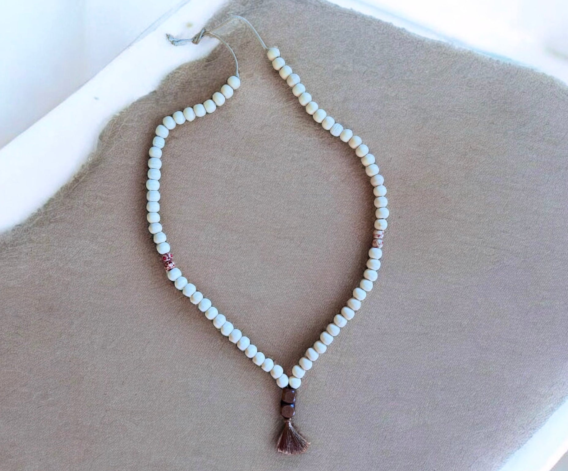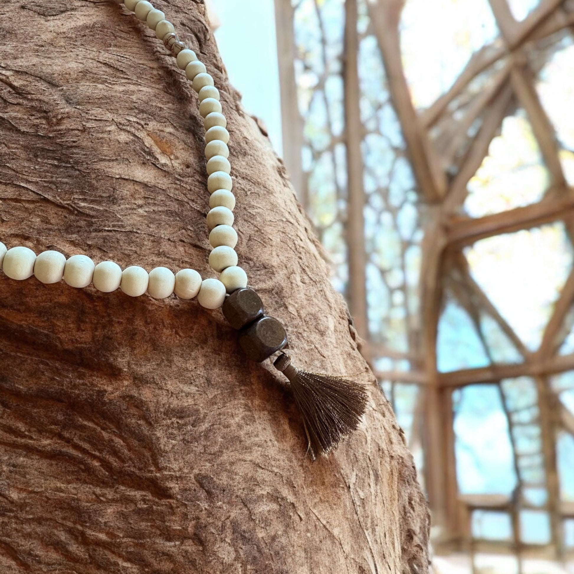Beschreibung: Tassel Necklace strahlt Ruhe und Gelassenheit aus. Matte, beige Perlen wechseln sich mit kleinen, dezenten Akzentperlen ab, während die zarte Quaste am Ende den Look abrundet. Ob als minimalistisches Statement oder als Begleiter für Yoga, Meditation und Alltag – diese Kette bringt Harmonie in deinen Stil.