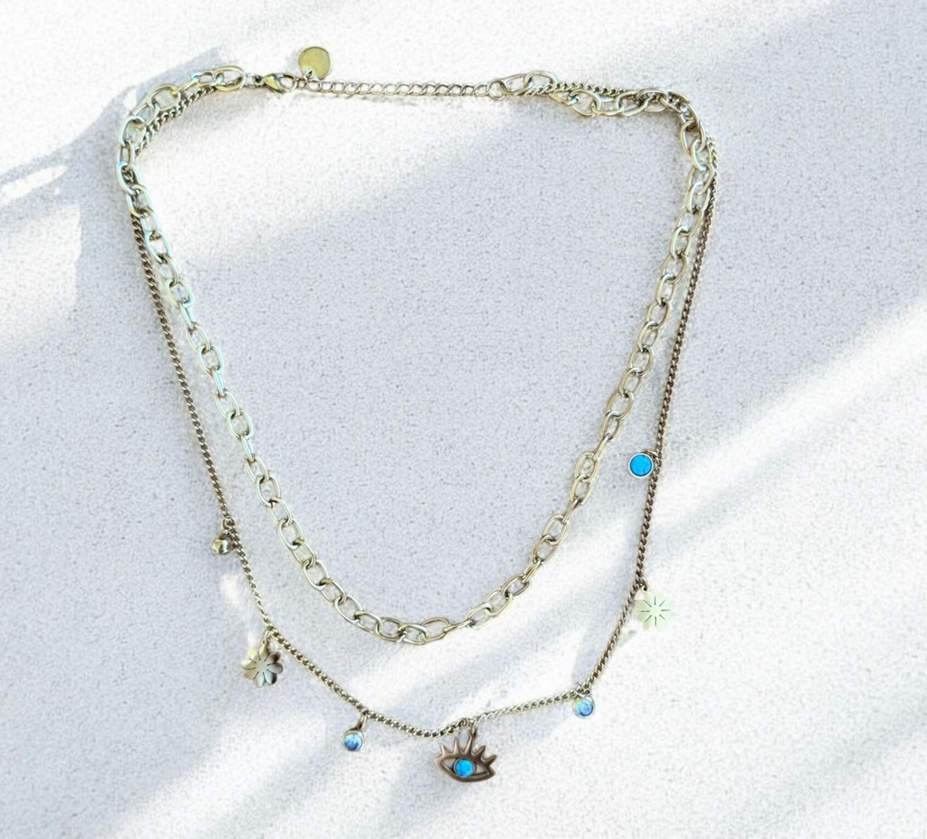 Beschreibung: Trendige doppellagige Kette mit Nazar-Anhänger, funkelnden Sternen und blauen Akzenten. Ein modischer Blickfang für Alltag und Party. Größe: 1. Kette: 36cm, 2. Kette: 43cm.