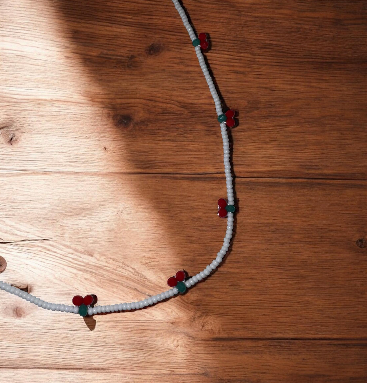 Beschreibung: Beaded Necklace bringt eine Portion Sommer & Spaß in deinen Look. Die weißen Glasperlen sind mit mehreren kleinen Kirschmotiven verziert – verspielt, frech und einfach süß. Ob als Highlight zu deinem Sommerkleid oder als niedlicher Akzent im Alltag, diese Halskette macht immer gute Laune