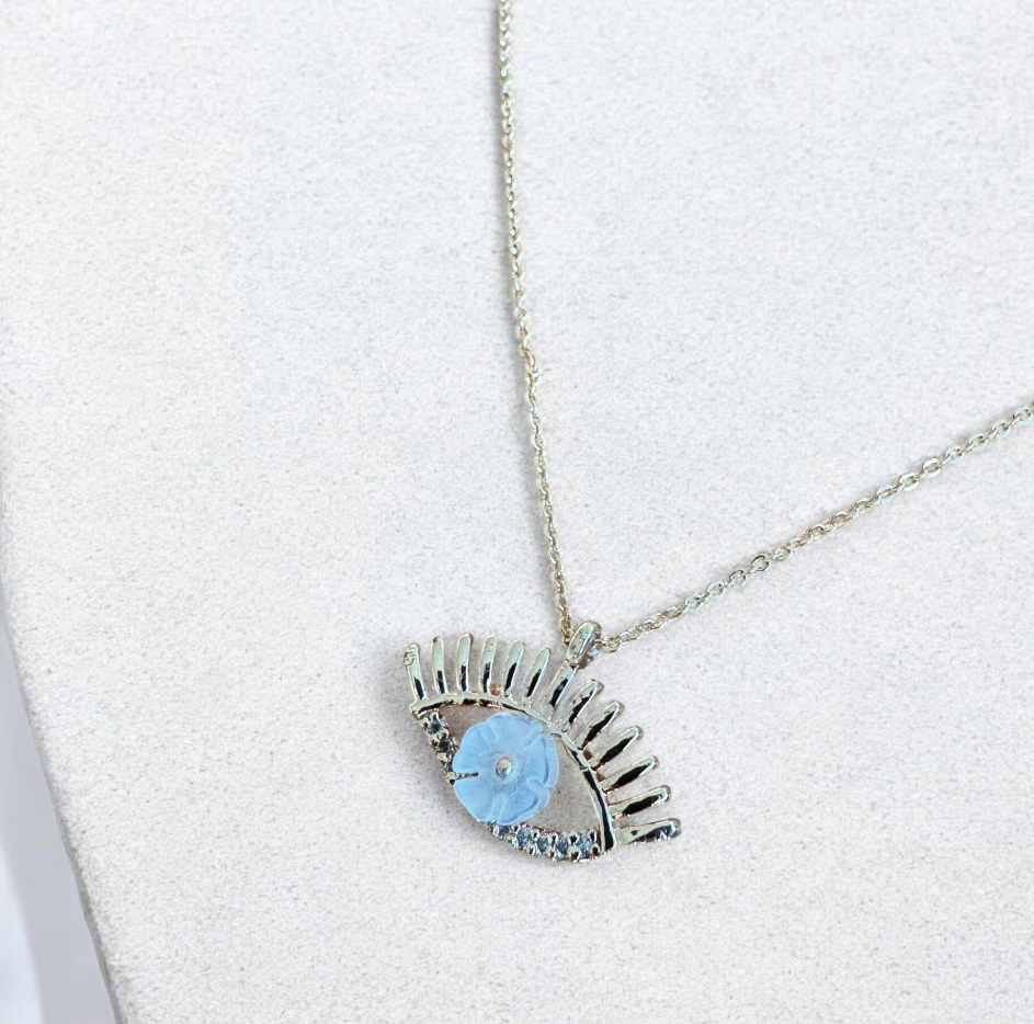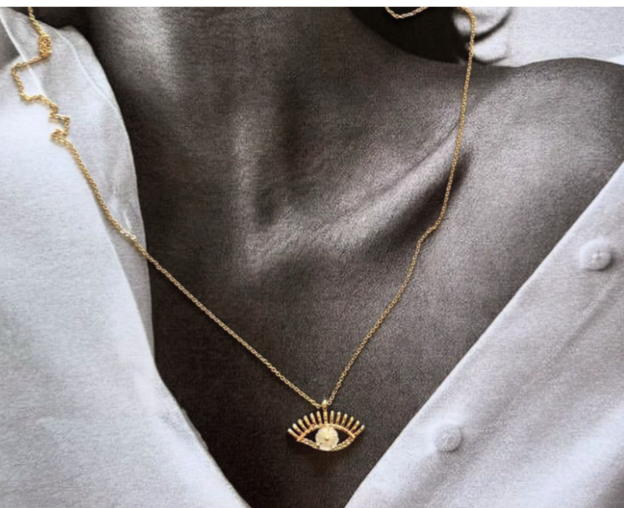 Beschreibung: Die Mystic Eye Halskette ist ein stilvoller Eyecatcher mit Bedeutung. Der filigrane Anhänger in Form eines Auges ist mit einem zarten, hellblauen Detail verziert und von funkelnden Steinchen umgeben. Ein modernes Schmuckstück, das nicht nur trendbewusst, sondern auch symbolisch für Schutz und Intuition steht – ideal für deinen Alltagslook oder als Geschenk mit Bedeutung. Größe: 43 cm.