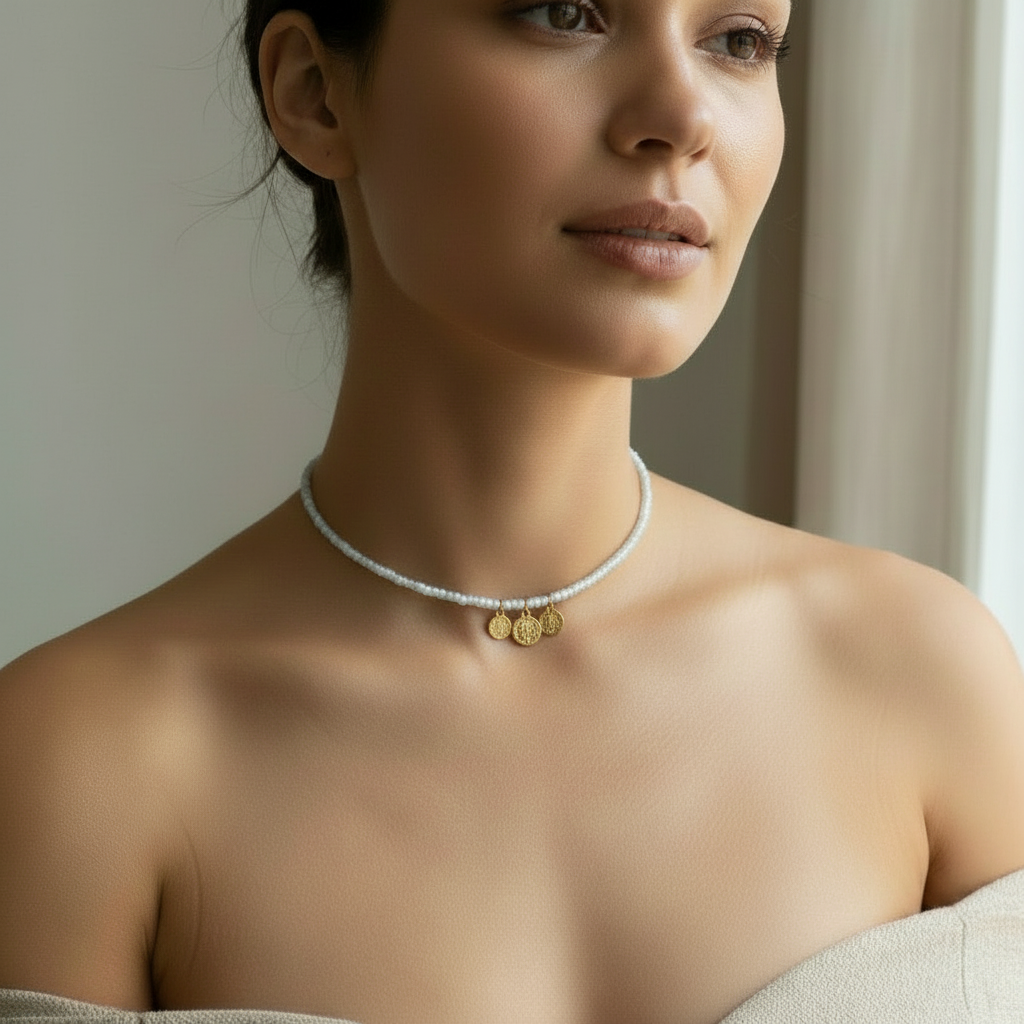 Beschreibung: Weiße Perlenkette mit goldenen osmanischen Tughra-Anhängern. Ein stilvolles Accessoire mit geschichtlicher Bedeutung und modernem Flair. Größe: 45cm.