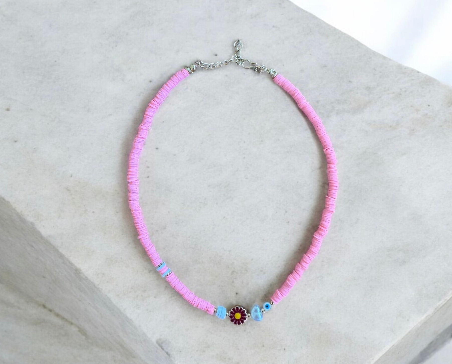 Beschreibung: Trendige Kette mit rosa Heishi-Perlen, Nazar-Auge und rotem Schmuckstein. Ein farbenfrohes Statement für moderne Looks. Größe: 41cm. Material: Heishi Perlen.