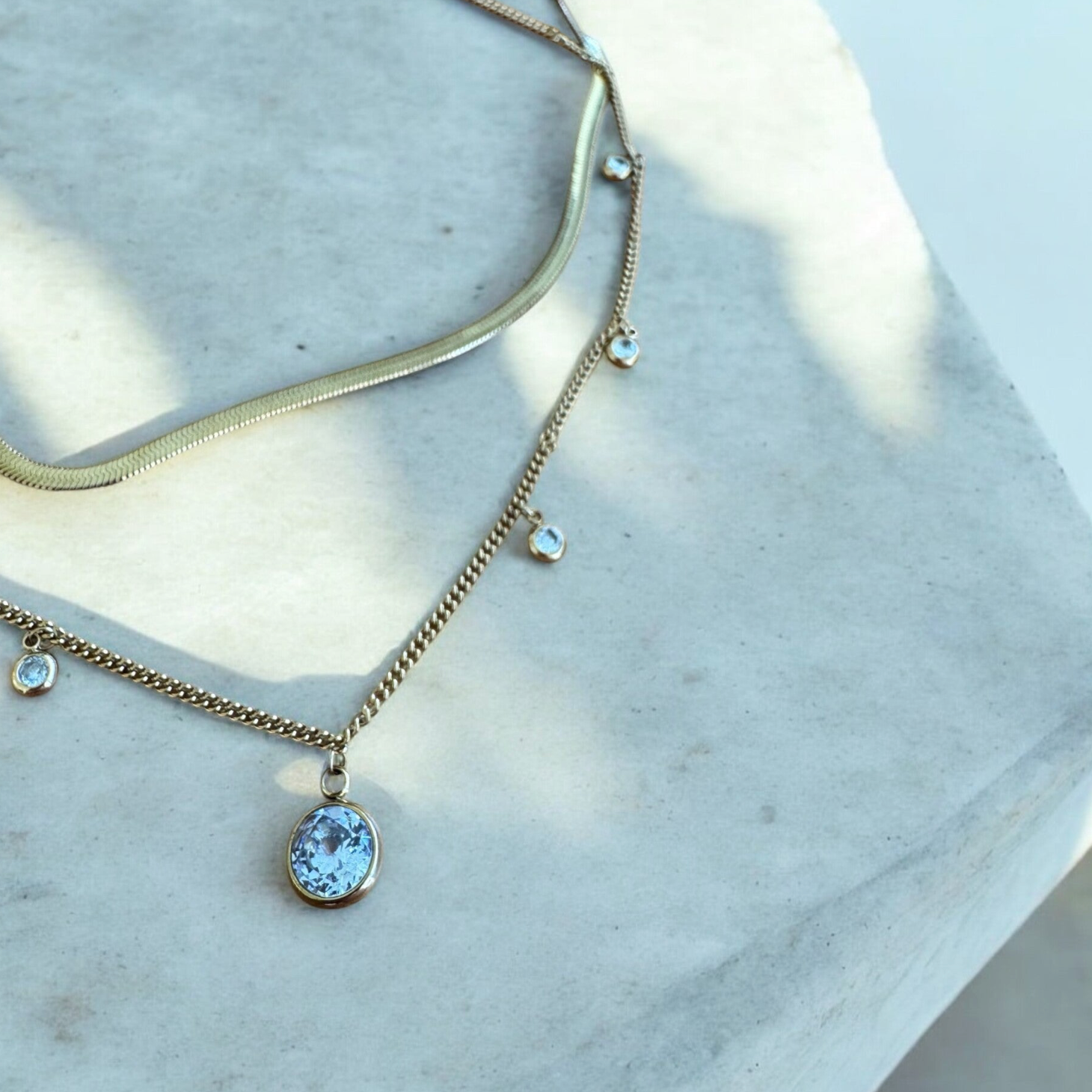 Beschreibung: Elegante doppellagige Kette mit zarten Kristallanhängern und einem funkelnden blauen Stein. Perfekt für einen stilvollen, femininen Look. Größe: 1. Kette: 39cm 2. Kette: 48cm. Material: 316L Edelstahl.