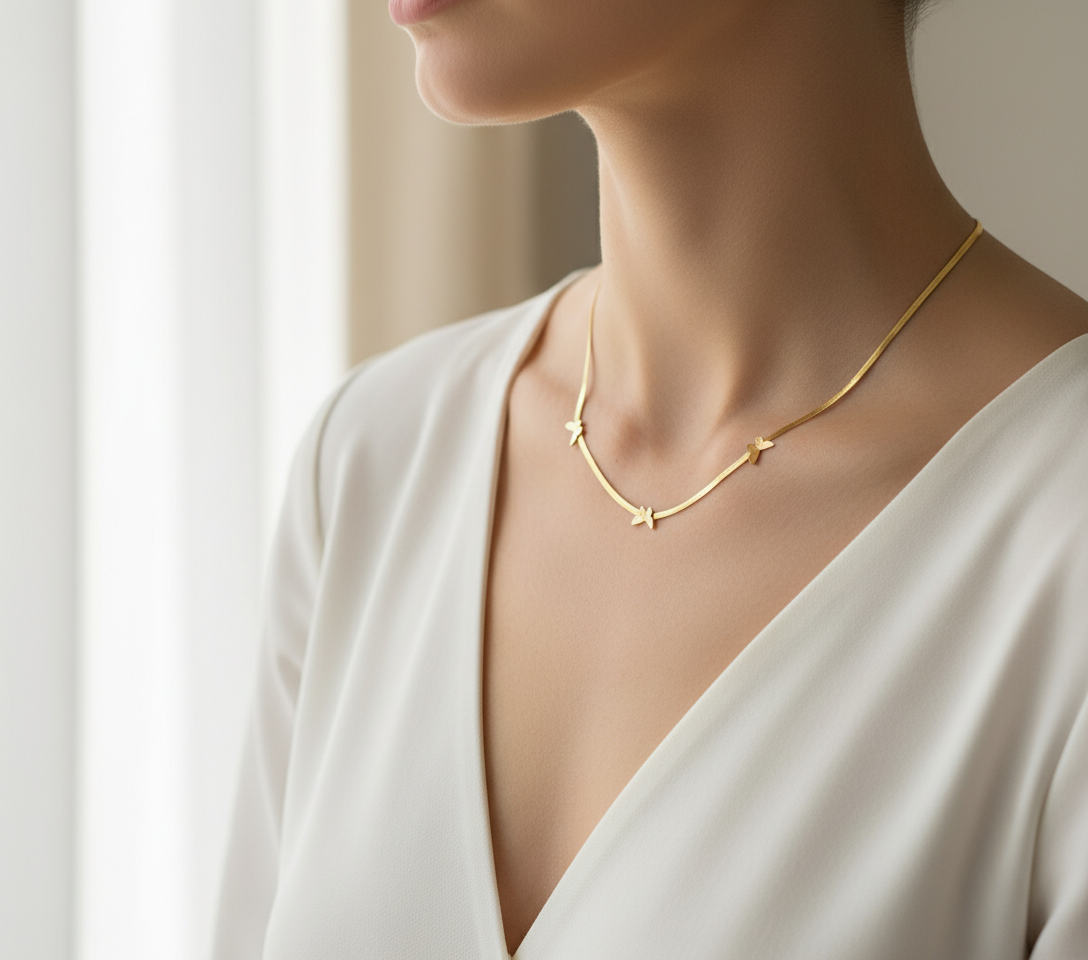 Beschreibung: Elegante Schlangenkette mit drei zarten Schmetterlingsanhängern. Perfekt für einen femininen Look mit einem Hauch von Leichtigkeit. Größe: 47cm. Material: 316L Edelstahl.