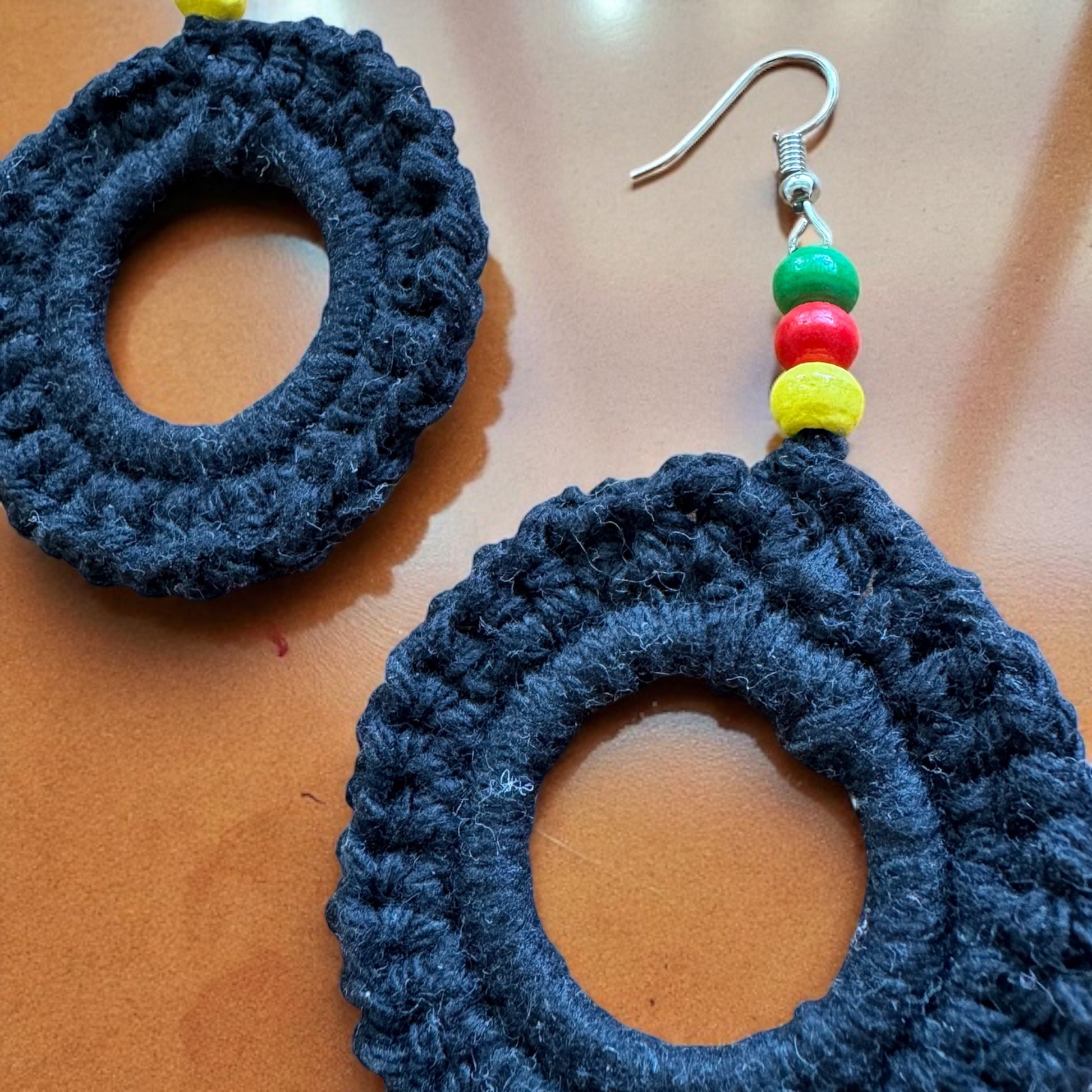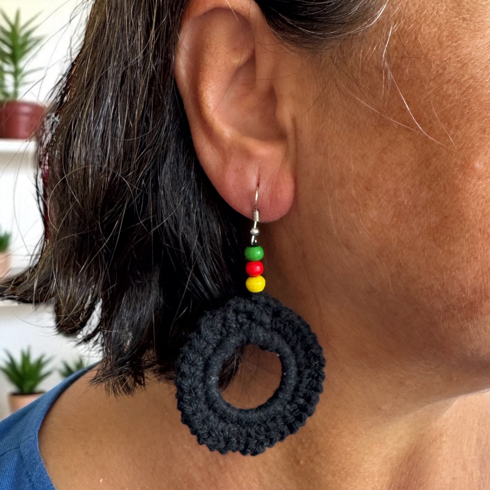 Beschreibung: Handgehäkelte Ohrringe in Schwarz mit leuchtenden Perlen in Rot, Gelb und Grün. Das schlichte Kreisdesign kombiniert mit den auffälligen Farben verleiht ihnen einen modernen Boho-Style – perfekt für Sommer, Festivals oder als farbenfrohes Highlight im Alltag.