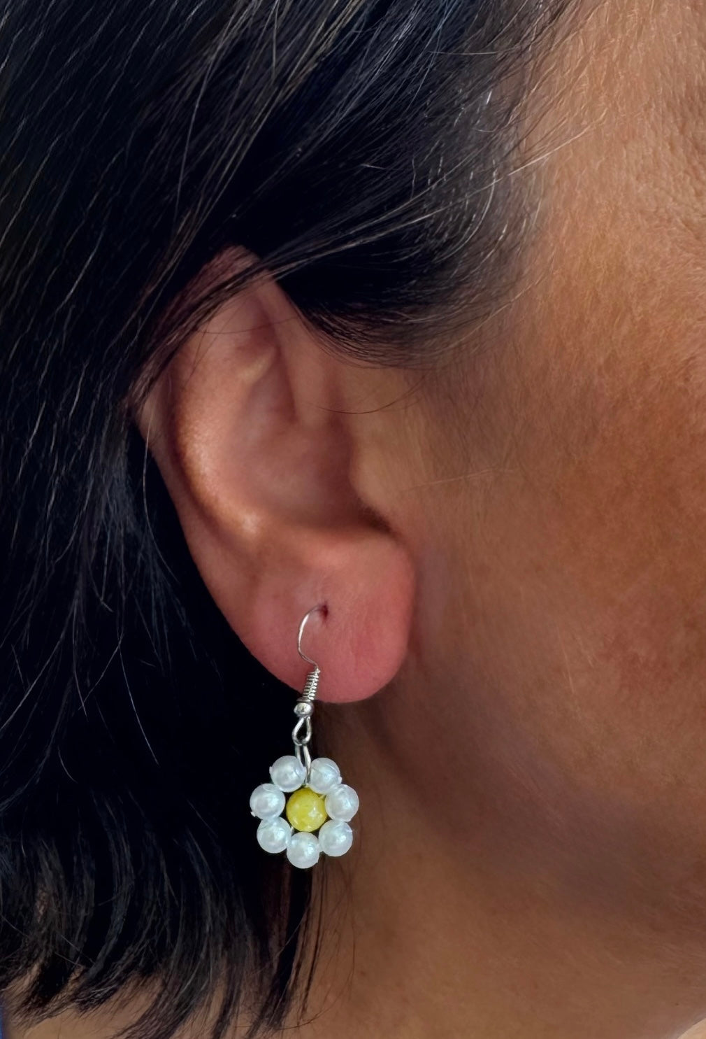 Beschreibung: Zarte Ohrringe mit Blumenmotiv aus schmimmernden Perlen. Die weiße Blüte mit gelber Mitte wird von einem silberfarbenen Haken gehalten - leicht, verspielt und handgemacht.