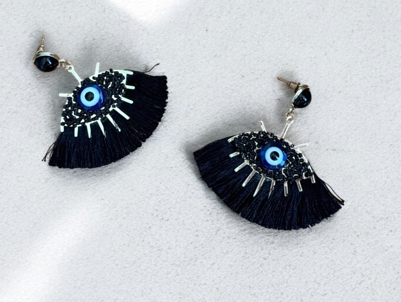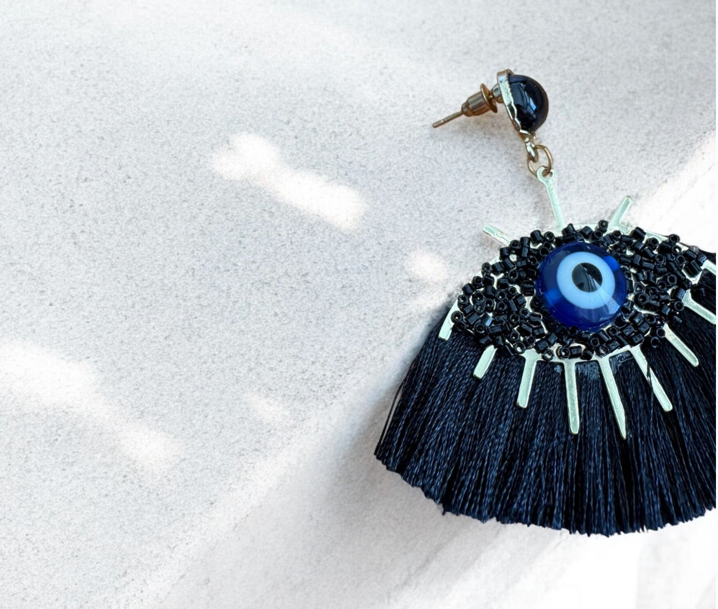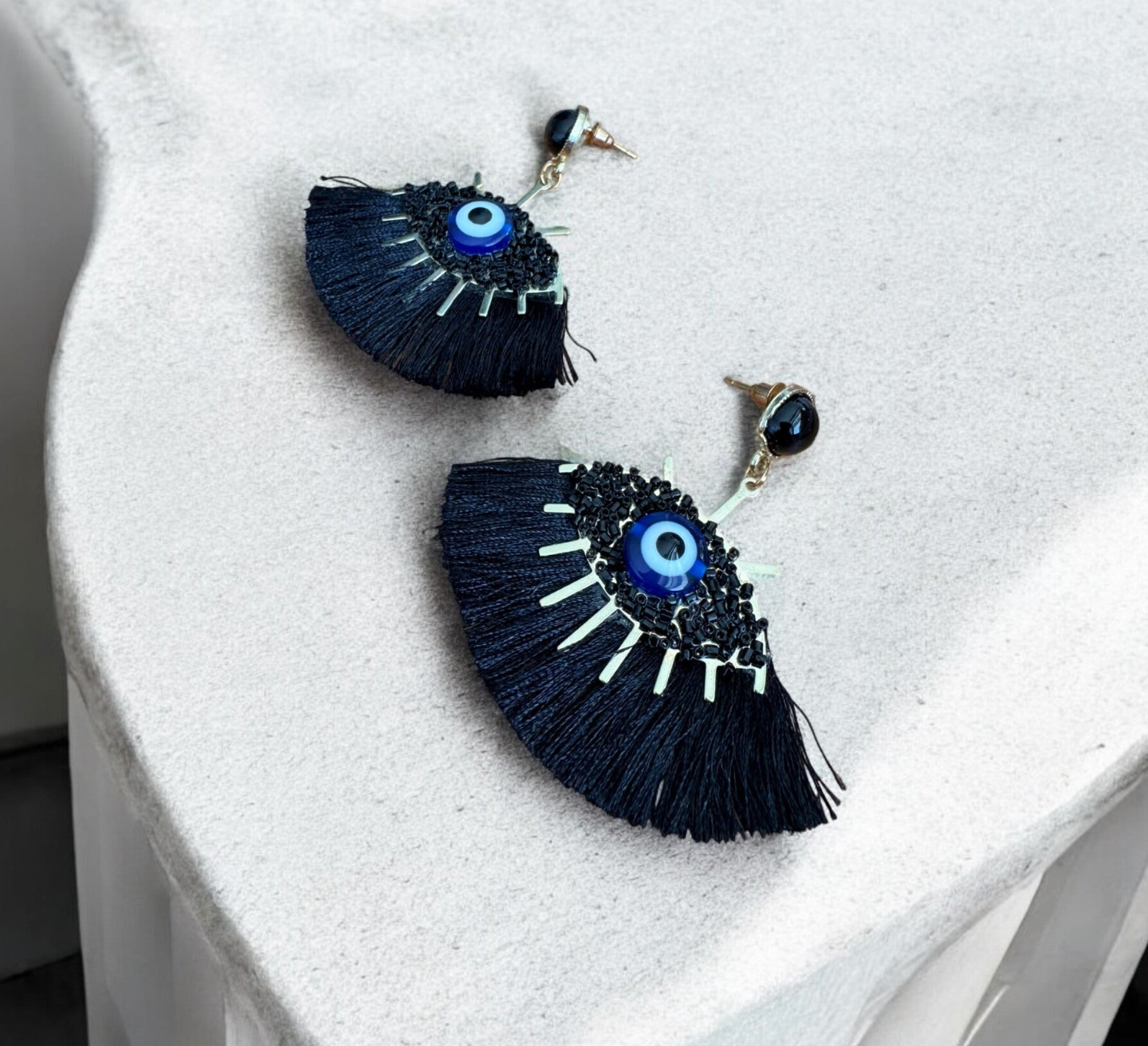 Beschreibung: Diese außergewöhnlichen Statement-Ohrringe vereinen das ikonische Nazar-Symbol mit filigranen schwarzen Fransen, die dem Look eine geheimnisvolle Eleganz verleihen. Der Ohrstecker ist mit einem glänzenden schwarzen Cabochon besetzt, während das Auge in kräftigem Blau den Mittelpunkt bildet – stilvoll, schützend, ausdrucksstark.