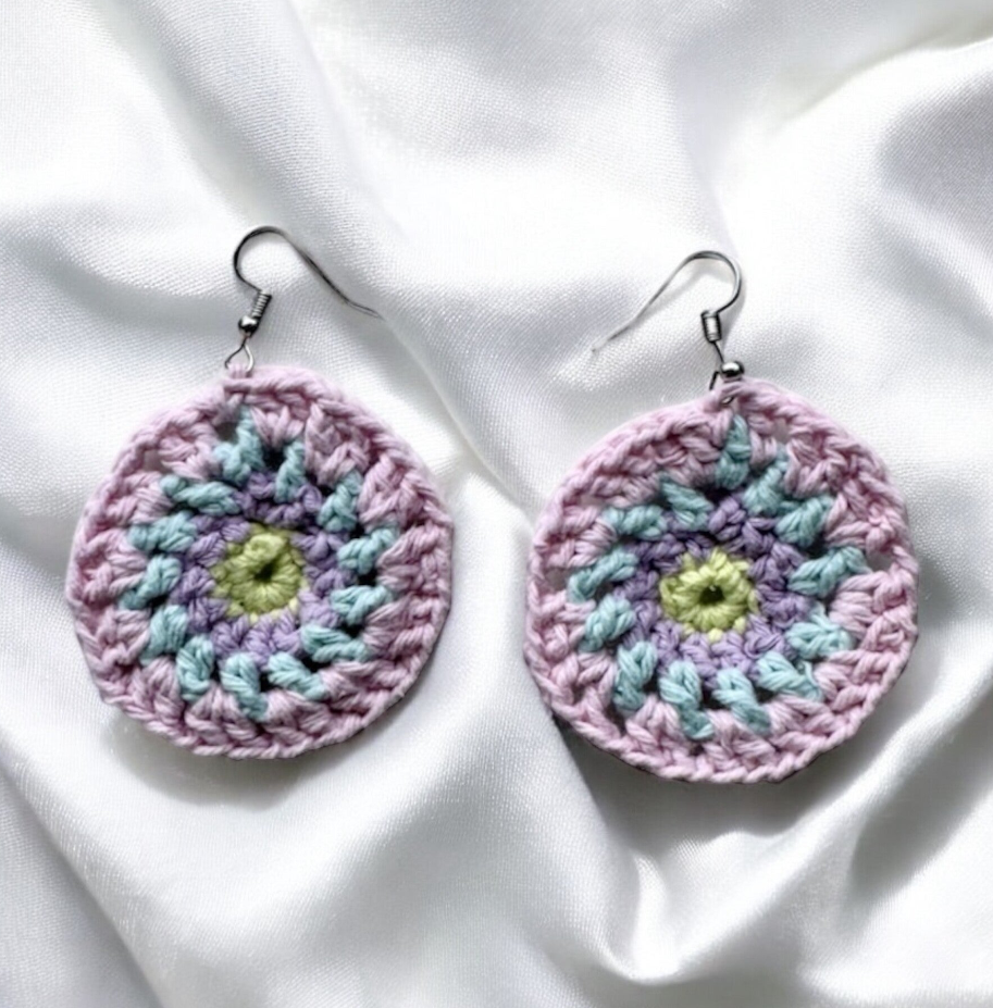 Beschreibung: Diese handgefertigten Ohrringe bestehen aus gehäkelten, runden Motiven in sanften Pastellfarben wie Rosa, Blau und Lila, mit einem fröhlichen gelben Zentrum. Ihr zartes und verspieltes Design bringt eine frische und fröhliche Note in jedes Outfit. Perfekt für den Alltag oder besondere Anlässe.
