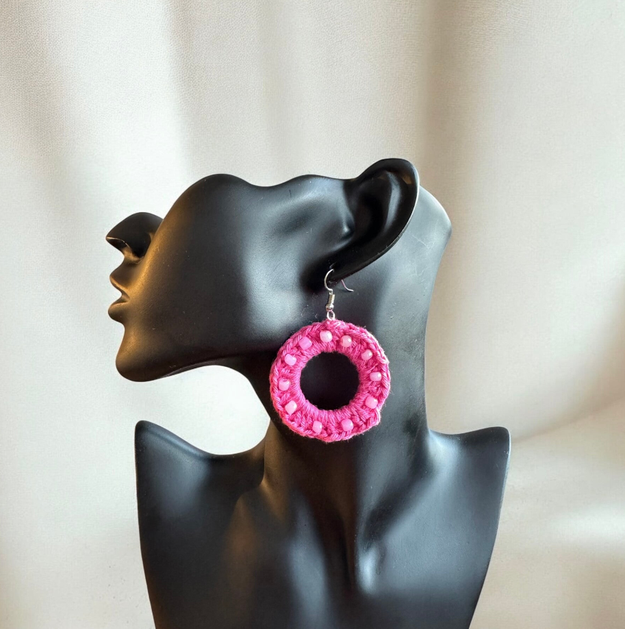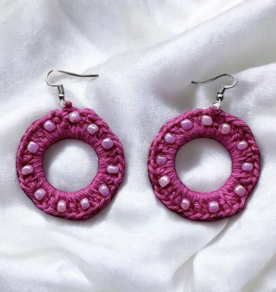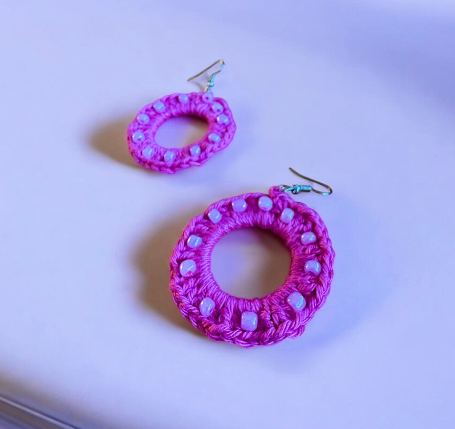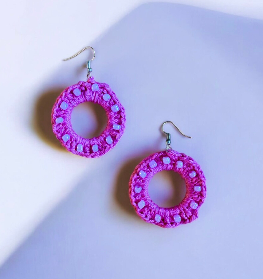 Beschreibung: Diese handgefertigten Ohrringe bestehen aus pinkfarbenen, gestrickten Ringen, die mit kleinen Perlen verziert sind. Ihr auffälliges und feminines Design macht sie zu einem perfekten Accessoire, das jedem Outfit eine verspielte und elegante Note verleiht.