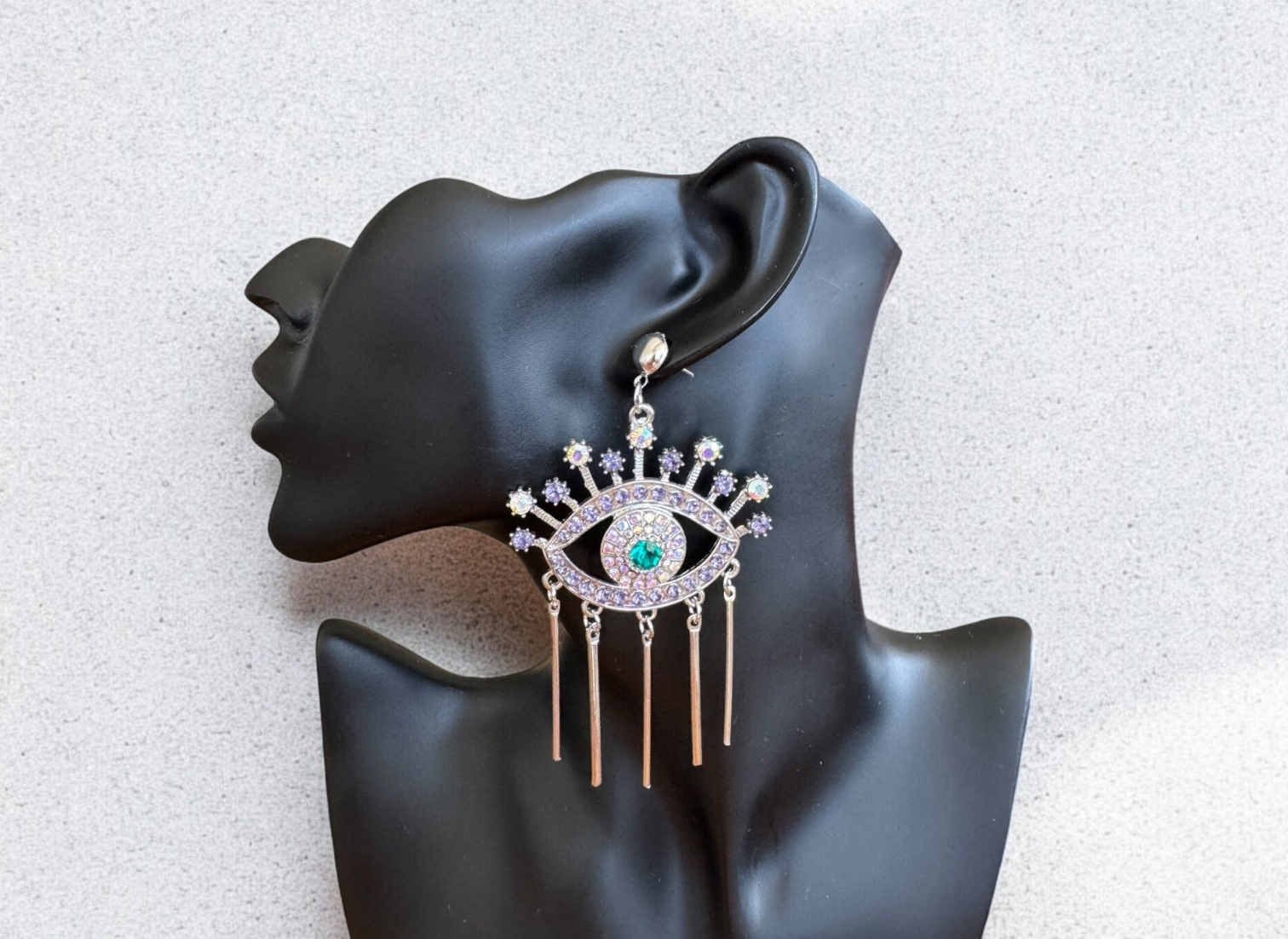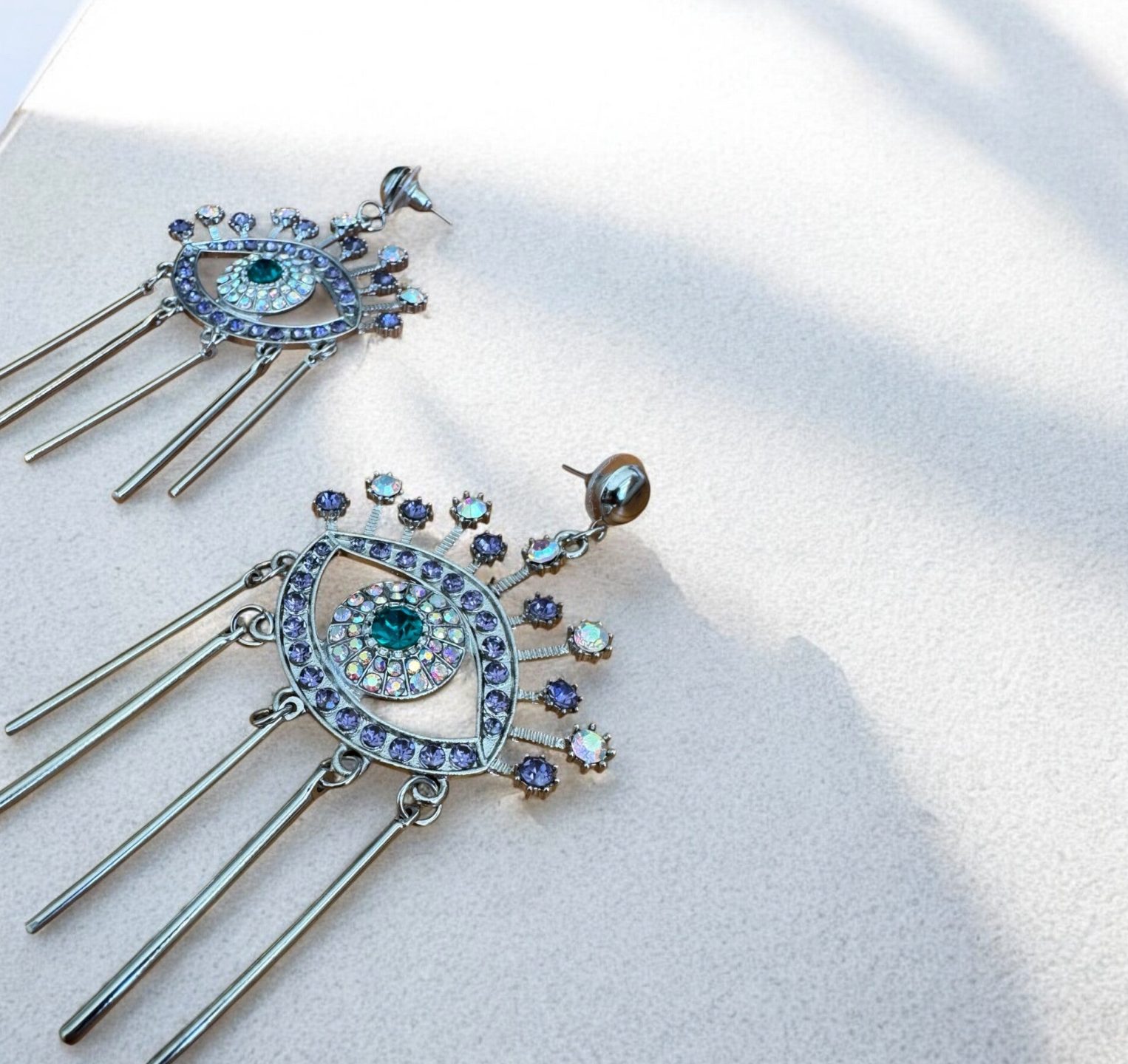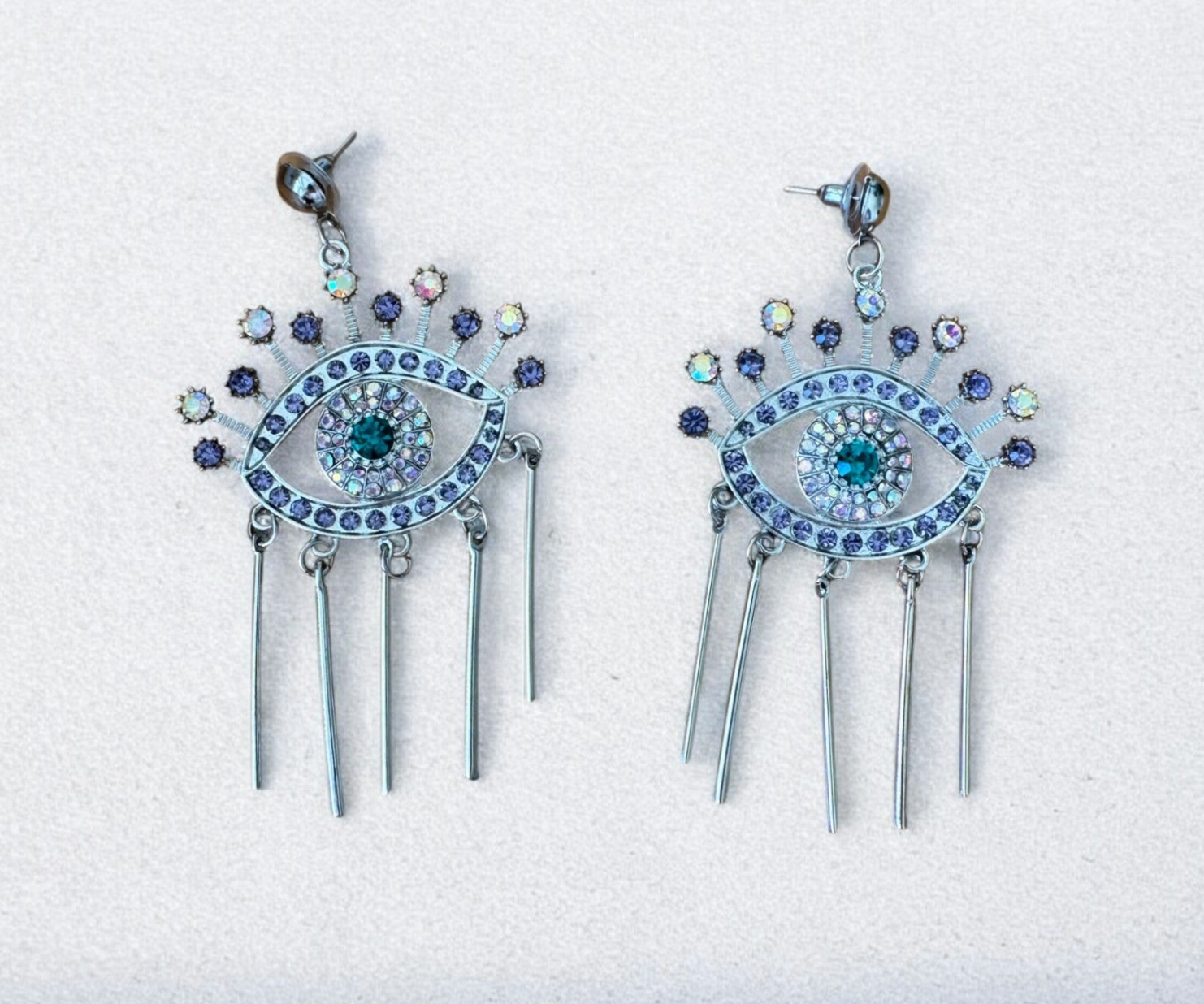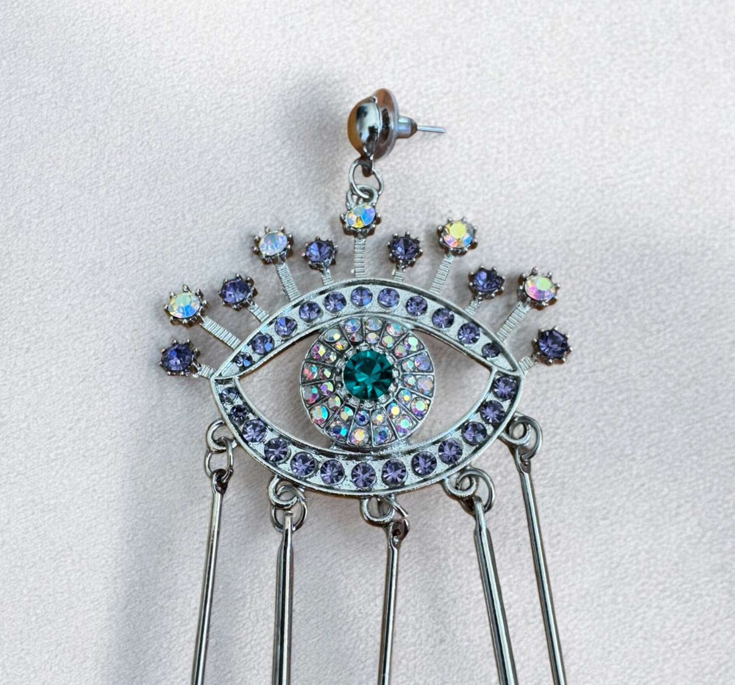 Beschreibung: Ausdrucksstarke Hängeohrringe in Form eines mystischen Auges, verziert mit funkelnden Kristallen in Violett, Blau und Regenbogentönen. Feine Metallstangen hängen elegant herab und erzeugen bei jeder Bewegung einen faszinierenden Look. Perfekt für alle, die Statement-Schmuck mit Bedeutung lieben.
