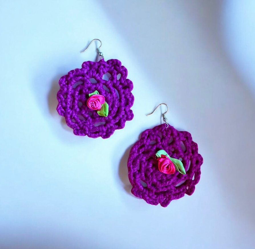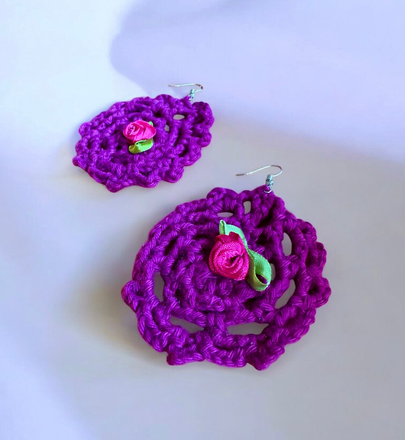 Beschreibung: Ein Hauch Vintage, ein Schuss Flower-Power! Diese gehäkelten Retro-Ohrringe in kräftigem Violett mit süßem Rosen-Detail bringen echtes 70s-Feeling zurück. Inspiriert vom Stil der Hippie-Ära – verspielt, laut und absolut einzigartig. Für alle, die ihren Look mit Farbe und Nostalgie aufpeppen wollen.
