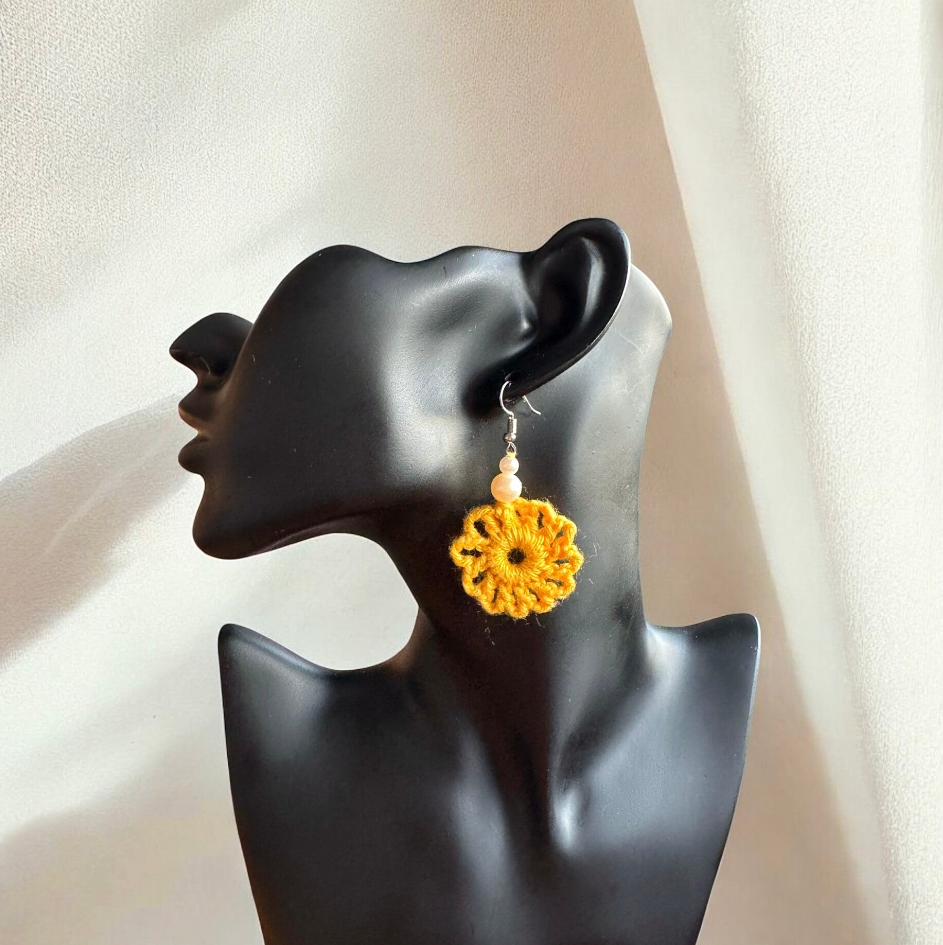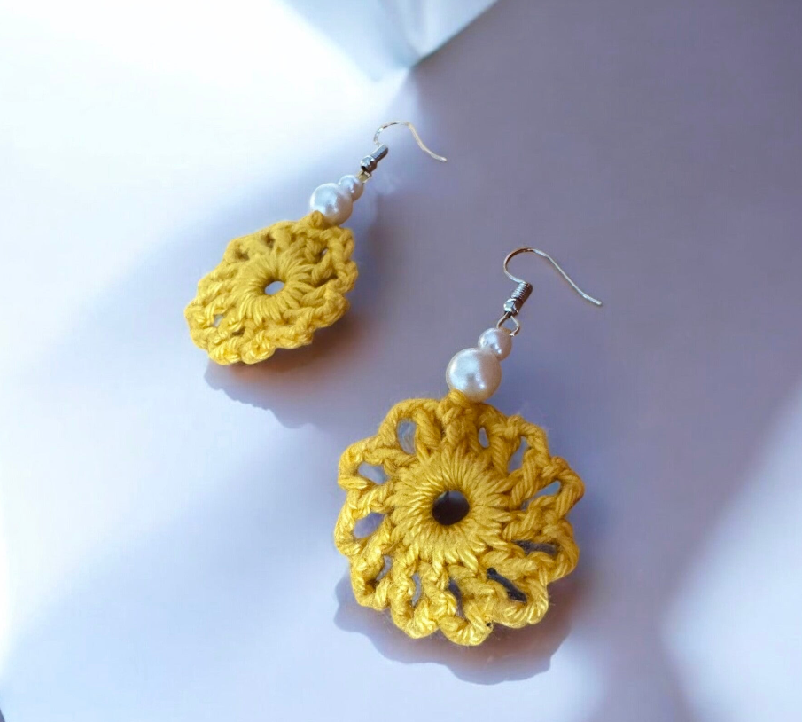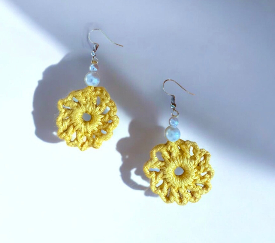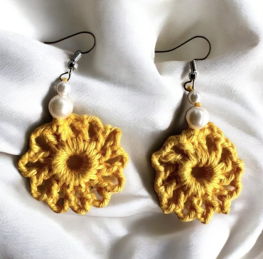 Beschreibung: Diese handgefertigten Ohrringe bestehen aus gelben, gehäkelten Blütenmotiven und sind mit zarten Perlen verziert. Das helle, fröhliche Design bringt einen Hauch von Sonnenschein und Eleganz in jedes Outfit. Ideal für alle, die handgemachte und einzigartige Schmuckstücke schätzen. Perfekt für den Sommer oder um jedem Tag eine fröhliche Note zu verleihen.