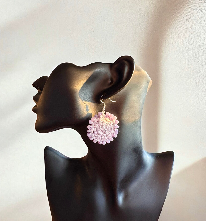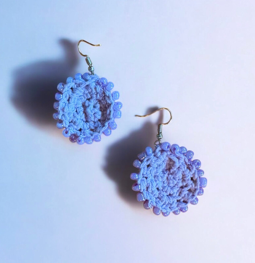 Beschreibung: Handgefertigte Ohrringe mit gehäkeltem Kreisdesign in Lavendel-Lila, verziert mit zarten Perlen am Rand. Leicht, verspielt und ideal für einen einzigartigen Boho-Look.
