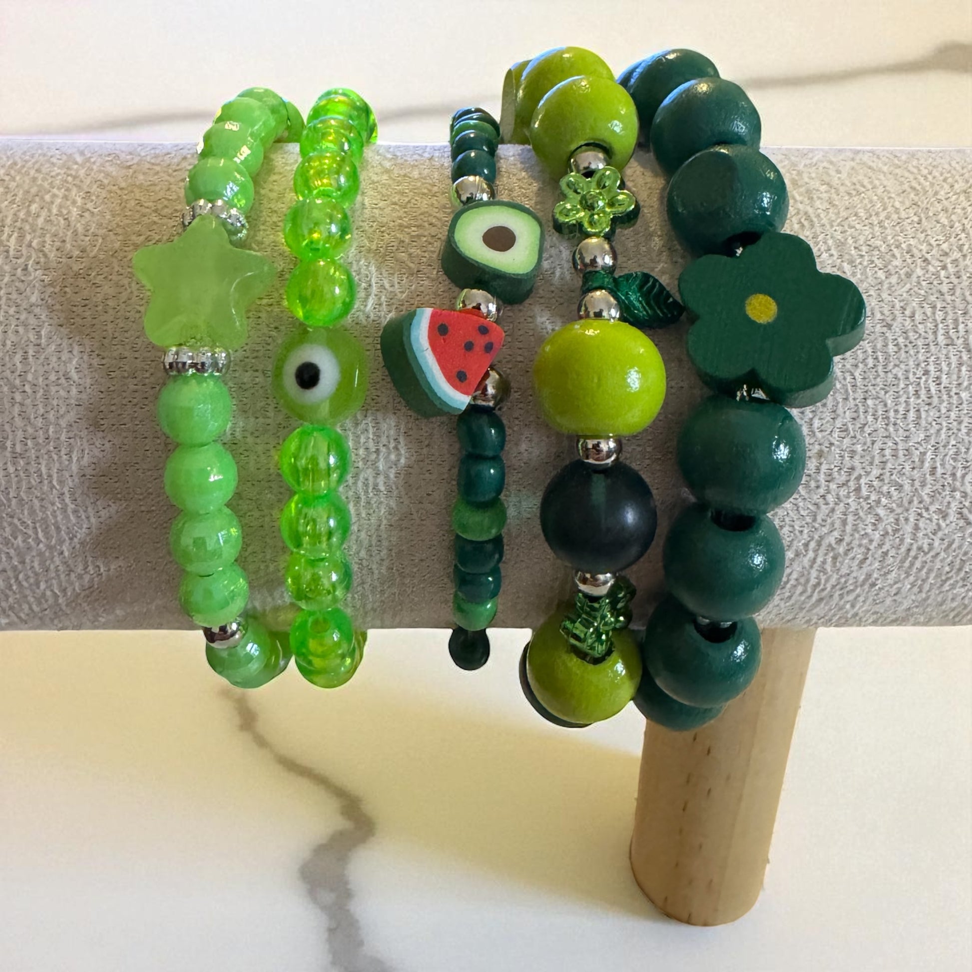 Beschreibung: Dieses Perlenarmband-Set kombiniert grüne Perlen mit einzigartigen Details: Avocado-, Wassermelonen-, Stern- und Blumenperlen. Es verbindet frische, natürliche Motive mit stilvollem Design für einen modernen und individuellen Look. Ideal für Liebhaber außergewöhnlicher Accessoires. Größe: Einheitsgröße, elastisch.