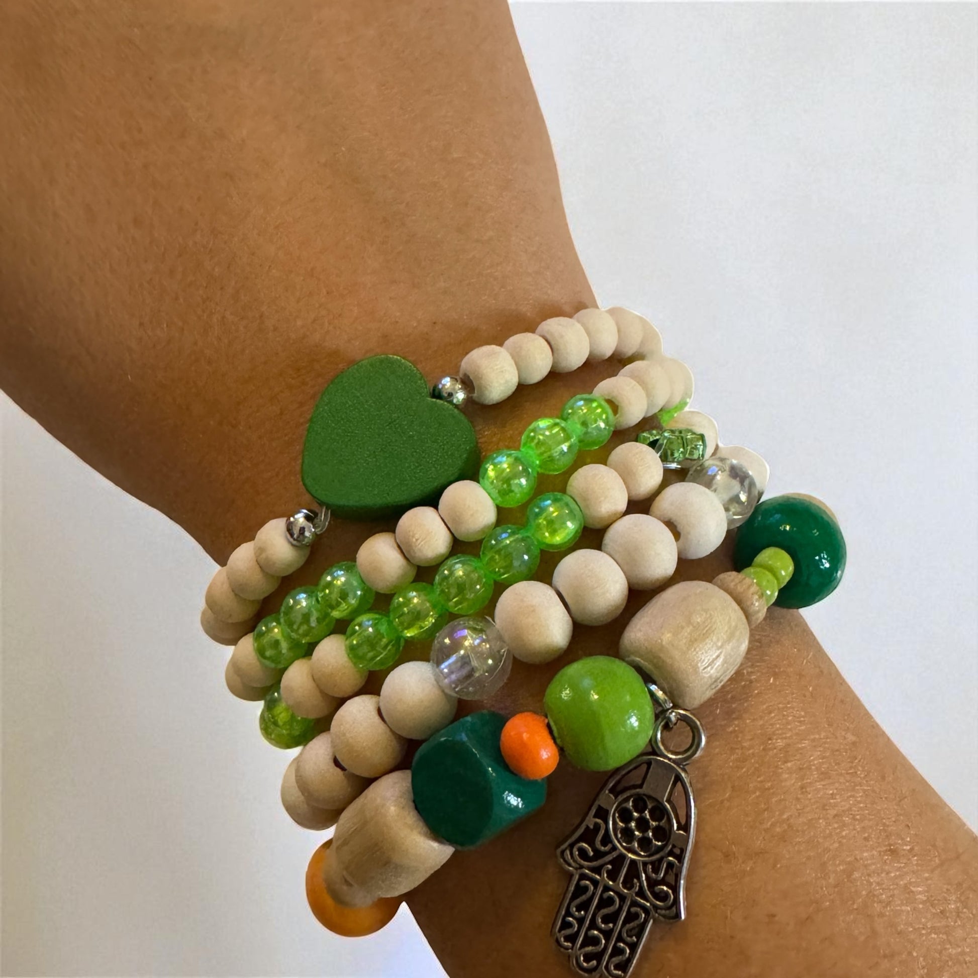 Beschreibung: Dieses Perlenarmband-Set kombiniert natürliche Holzperlen mit grünen Akzenten für ein harmonisches Erscheinungsbild. Ein besonderes Highlight bilden die grüne Herzperle und der Anhänger in Form der Hand der Fatima, die nicht nur als dekorative Elemente dienen, sondern auch Schutzsymbolik verkörpern. Das Set ist ideal für alle, die Wert auf stilvolle Accessoires mit Bedeutung legen und ihre Schmuckkollektion um ein zeitloses, kulturell inspiriertes Design erweitern möchten. Größe: Einheitsgröße, elastisch.