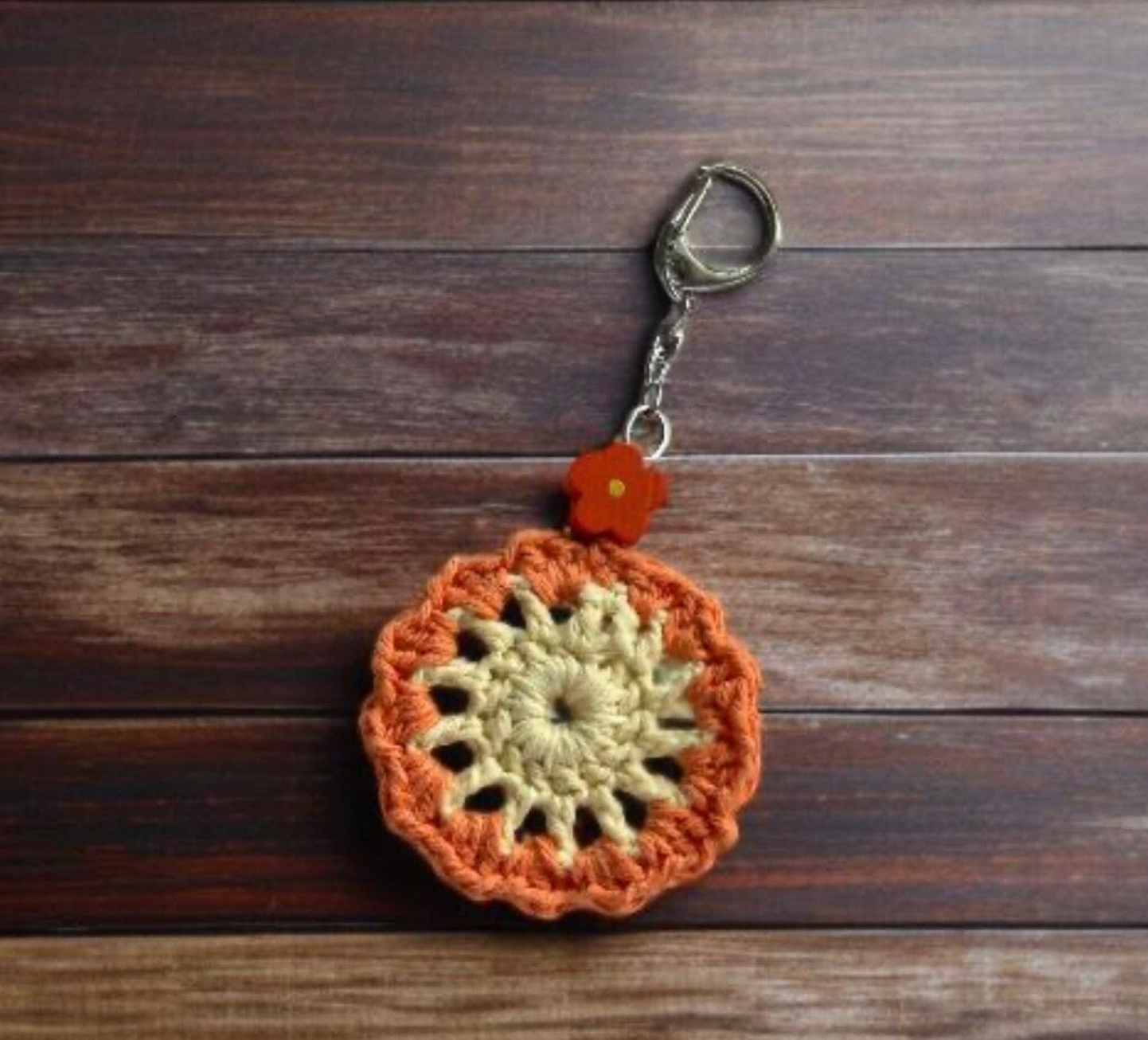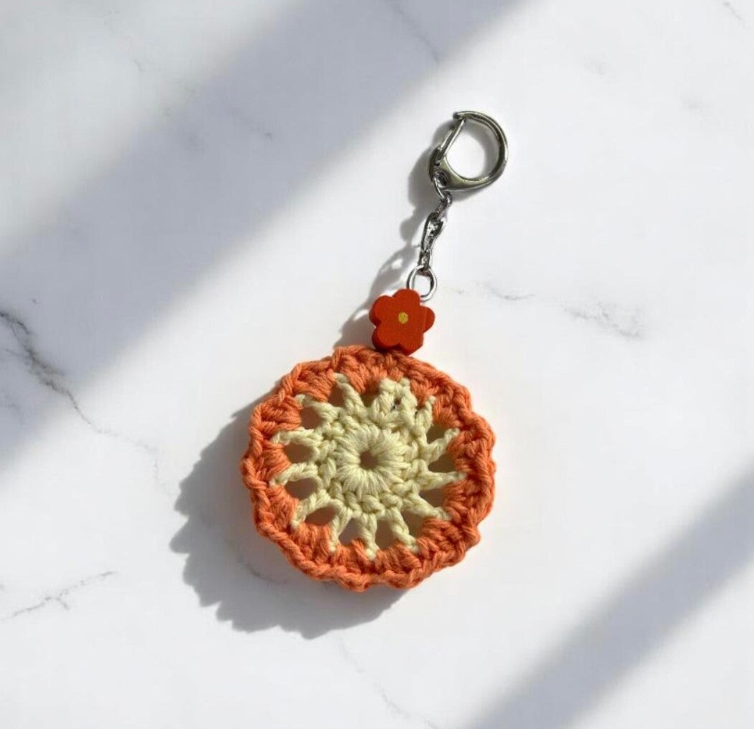 Beschreibung: Handgemachter Häkel-Schlüsselanhänger in warmen gelb- und Orangetönen, verziert mit einer kleinen Blumenperle und einem Metallverschluss. Länge: 12cm.